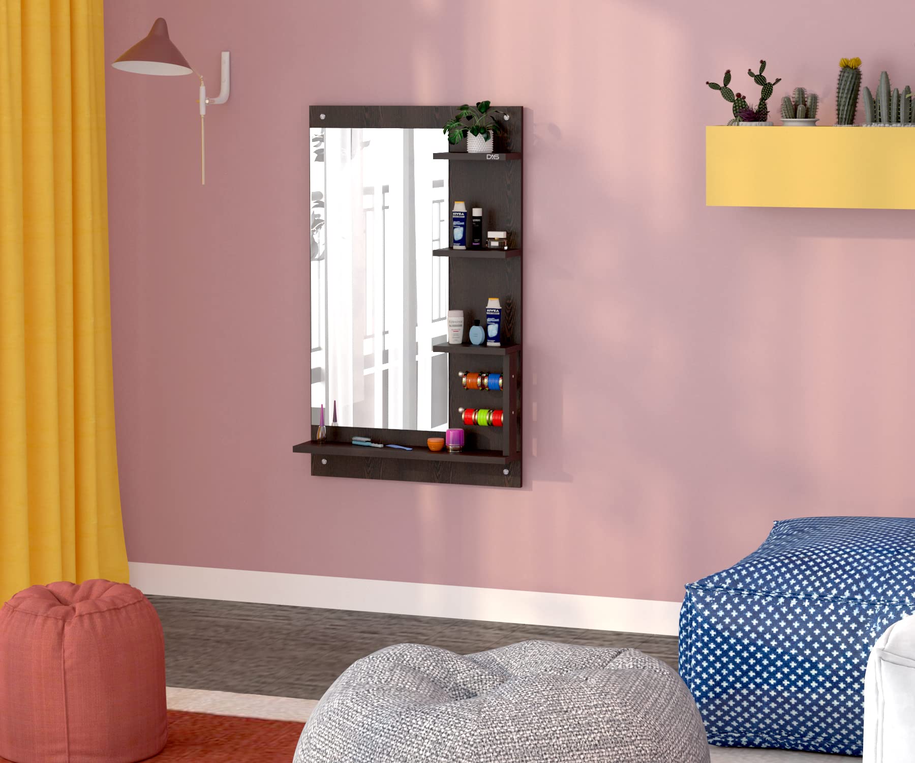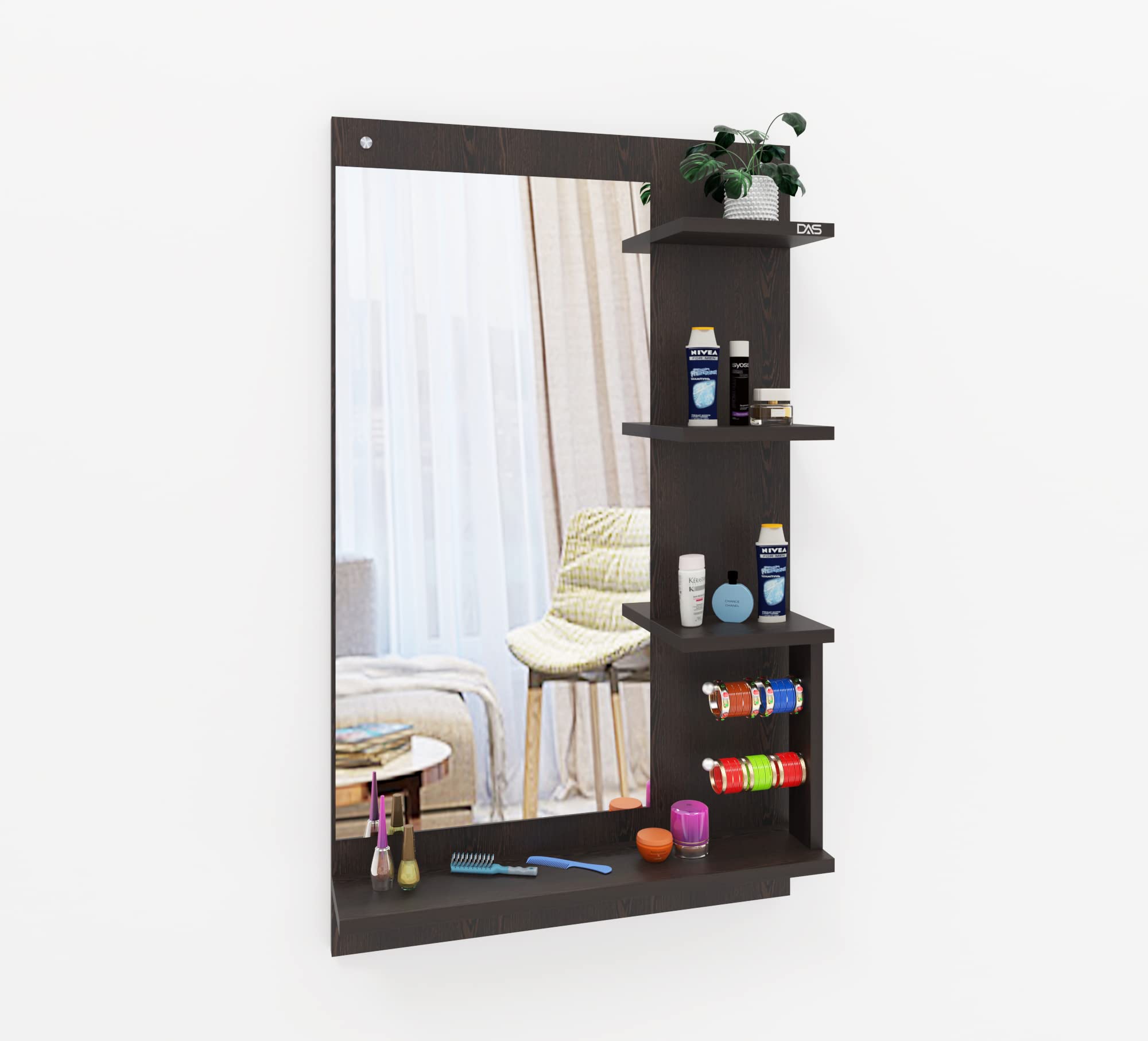Material- Engineered Wood, Glass and Stainless Steel. Product Dimensions- Wooden Frame- 100 x 60 cm, Mirror- 80 x 39 cm. Weight- 13 kg.
