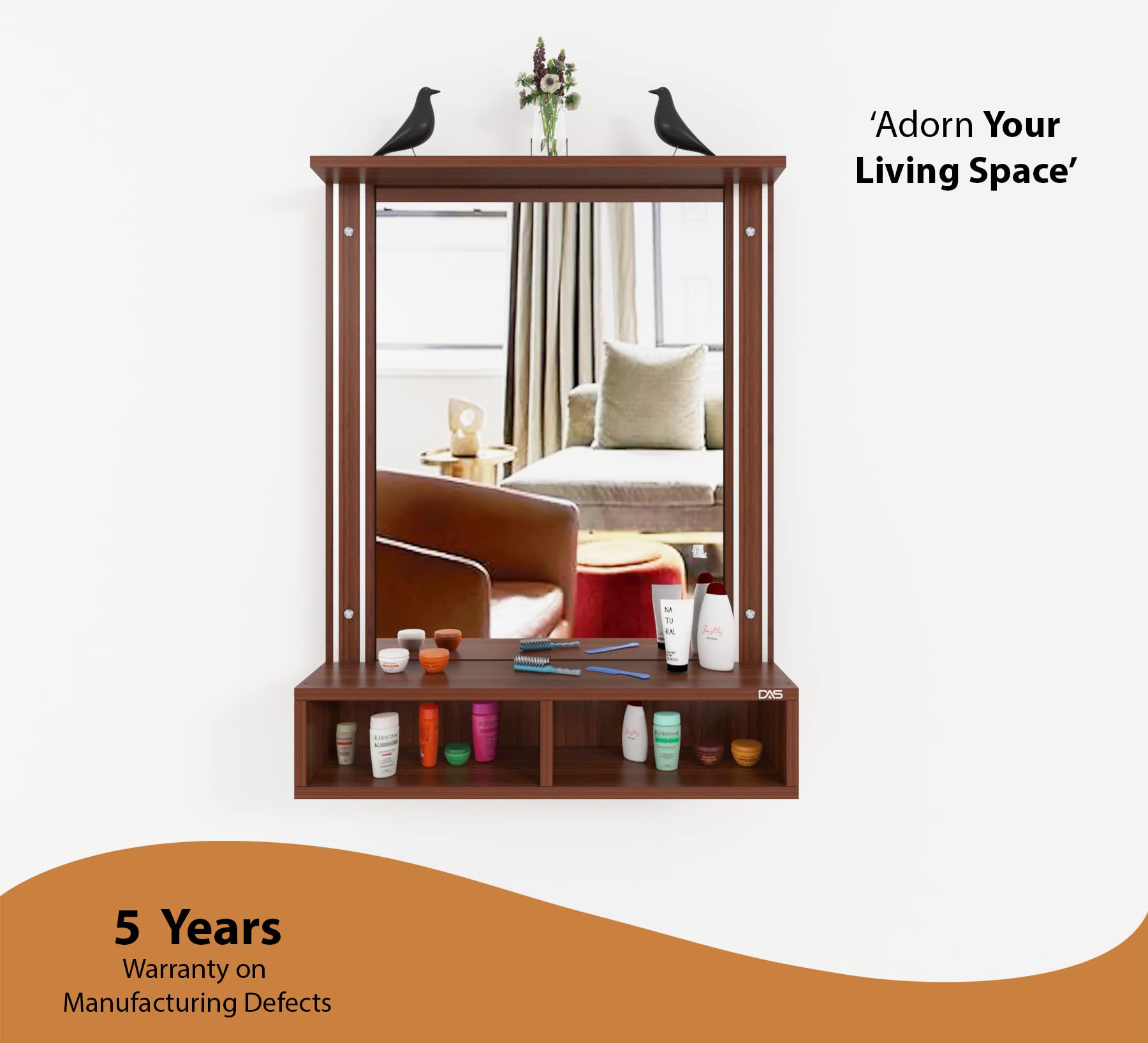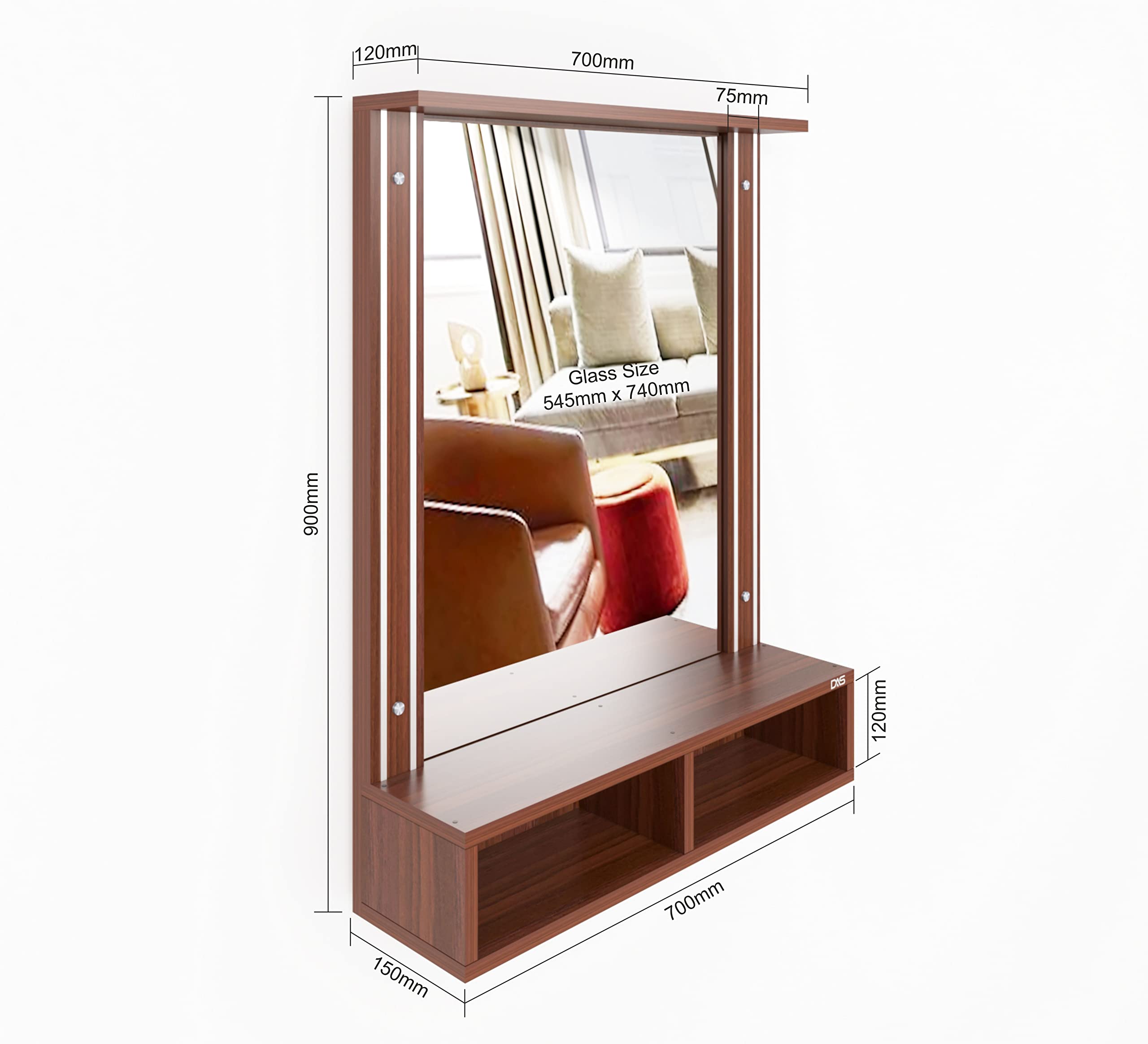 Material- Engineered Wood, Glass and Aluminum. Product Dimensions- Wooden Frame- 90 x 70 cm, Mirror- 74 x 54.5 cm, Storage Space- 70 x 15 x 12 cm, Weight- 15 kg.