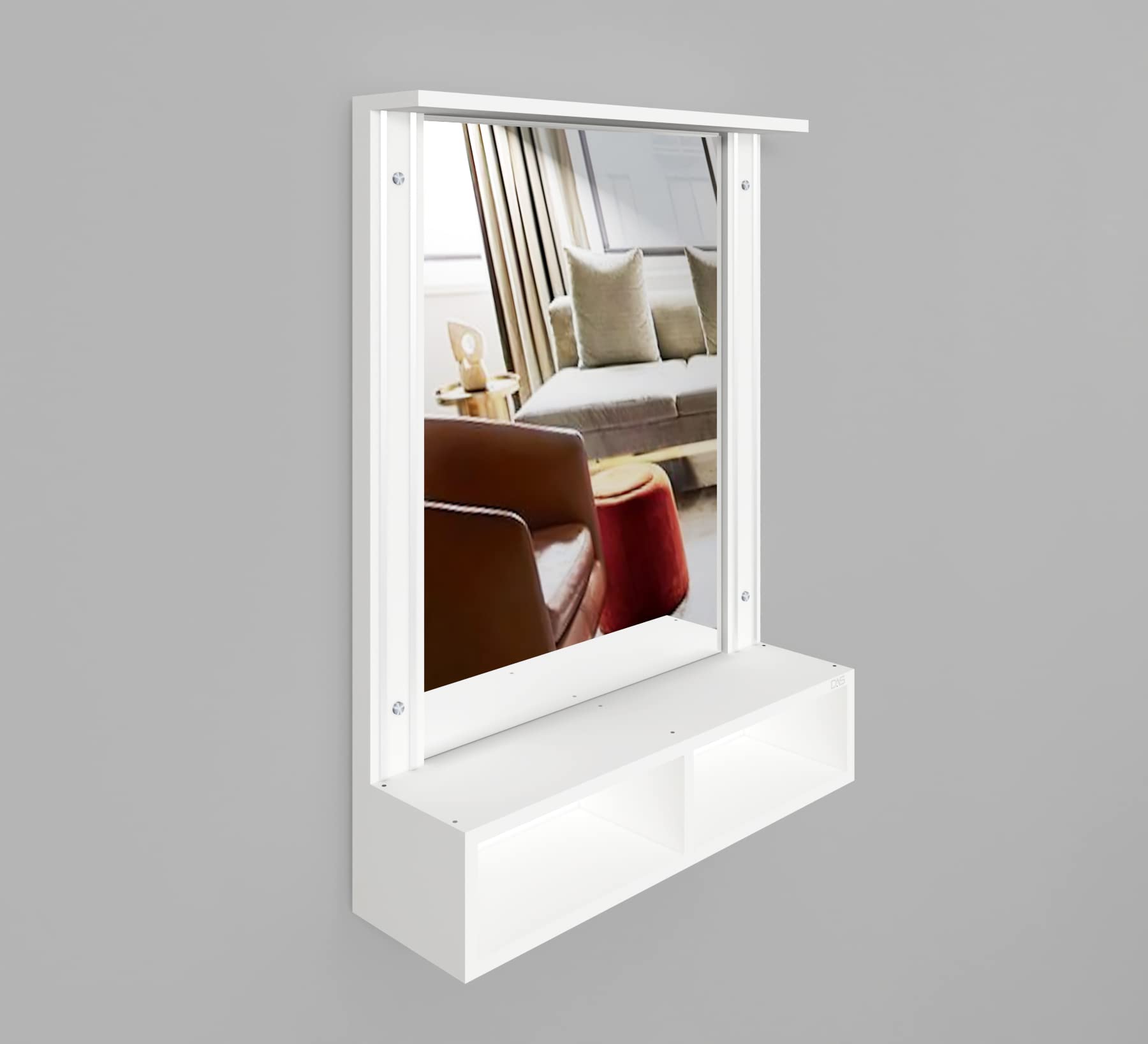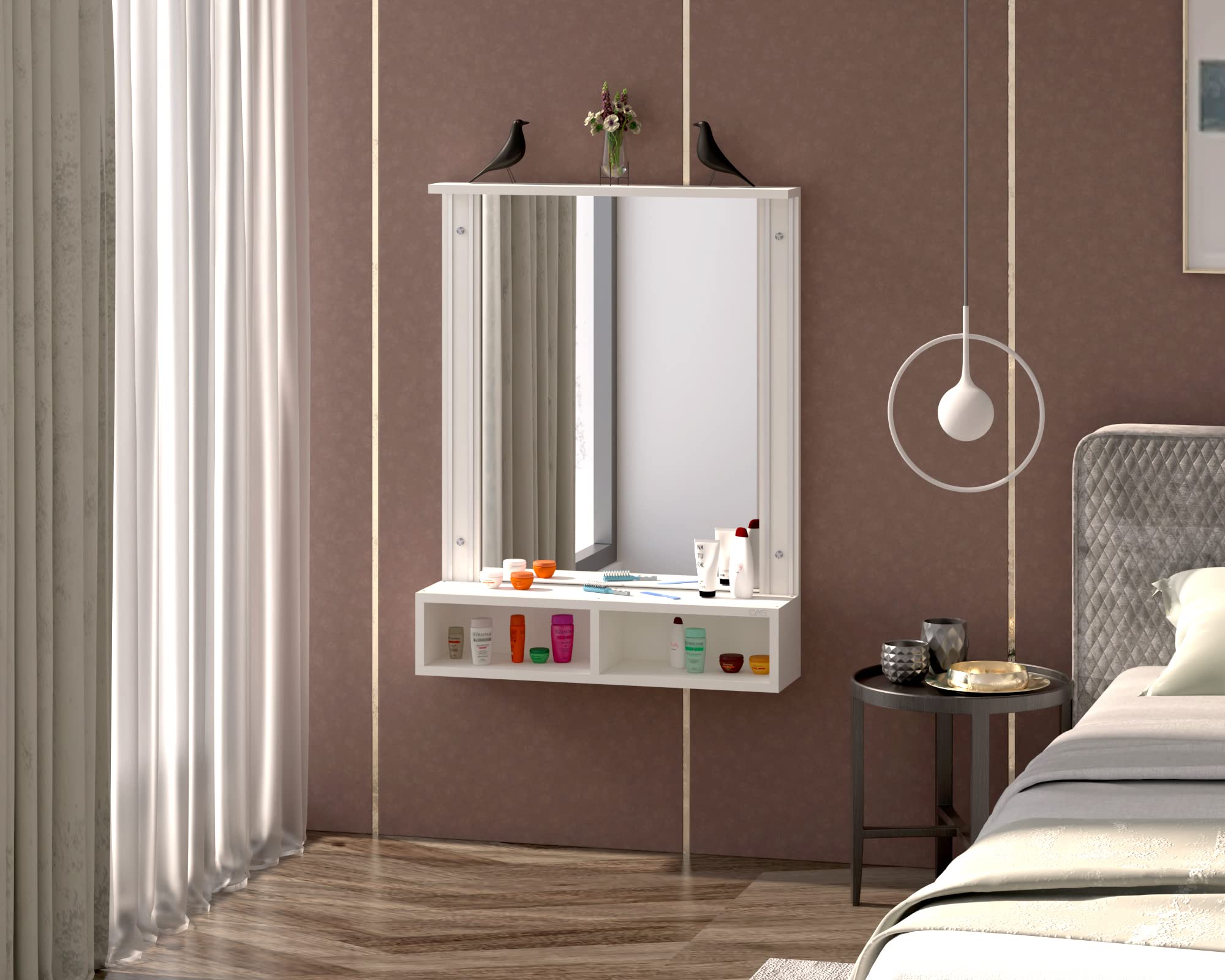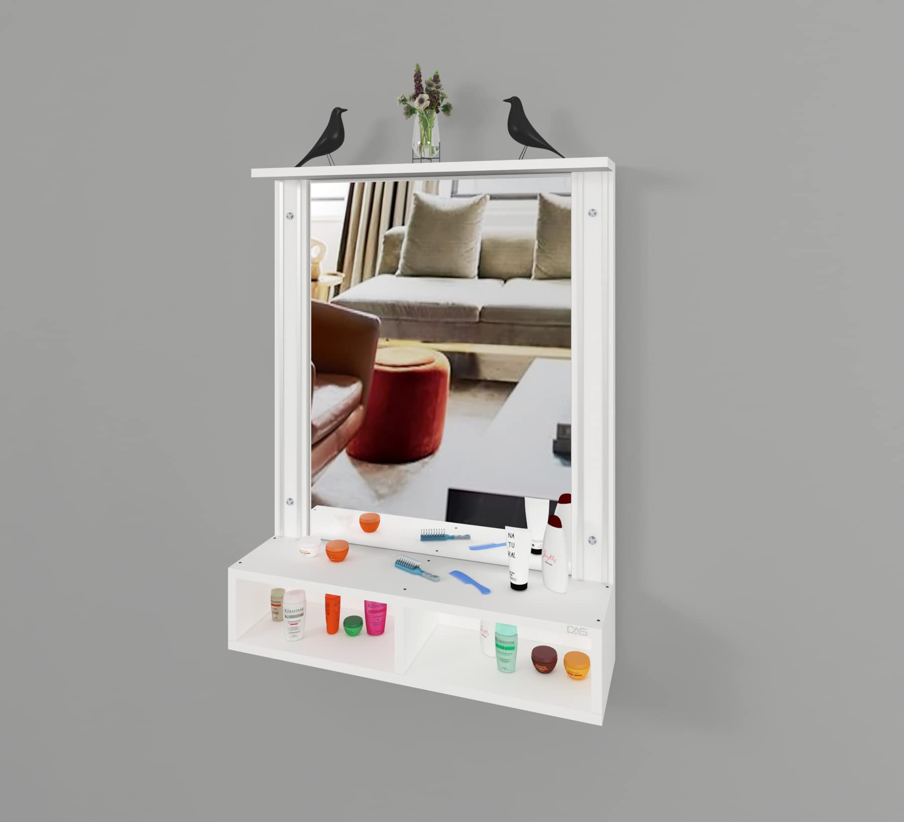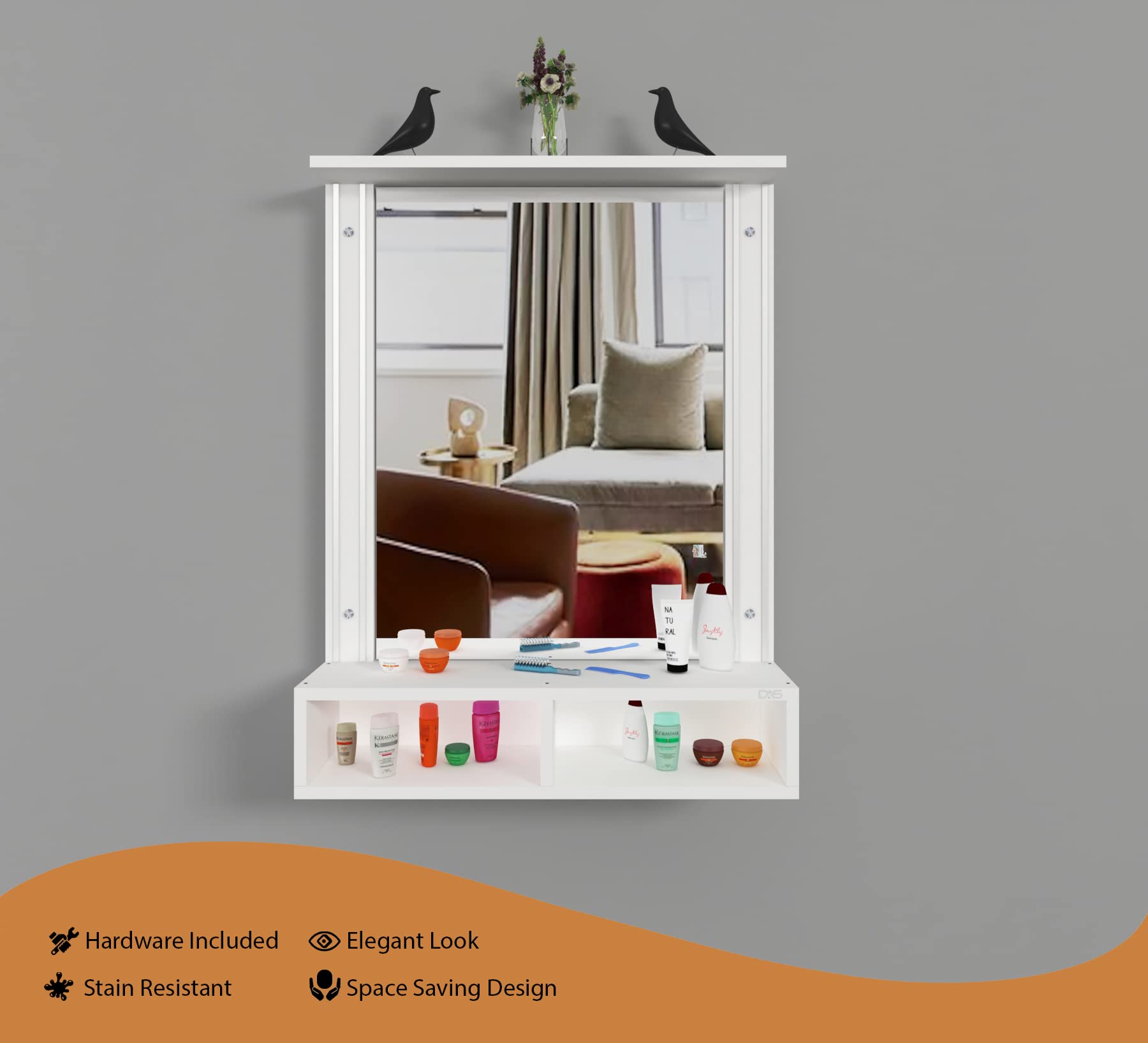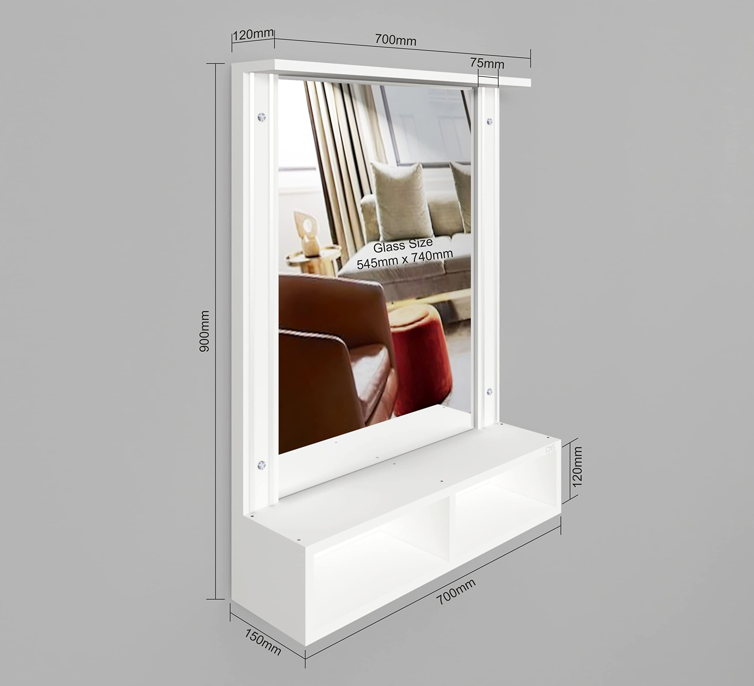 Material- Engineered Wood, Glass and Aluminum. Product Dimensions- Wooden Frame- 90 x 70 cm, Mirror- 74 x 54.5 cm, Storage Space- 70 x 15 x 12 cm, Weight- 15 kg.