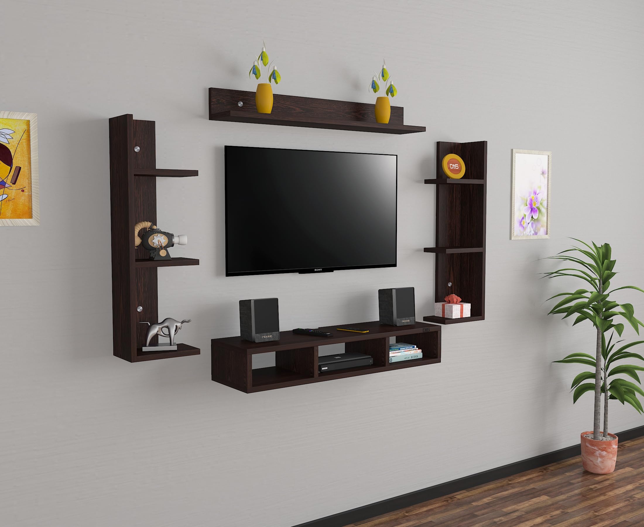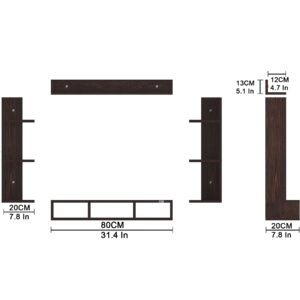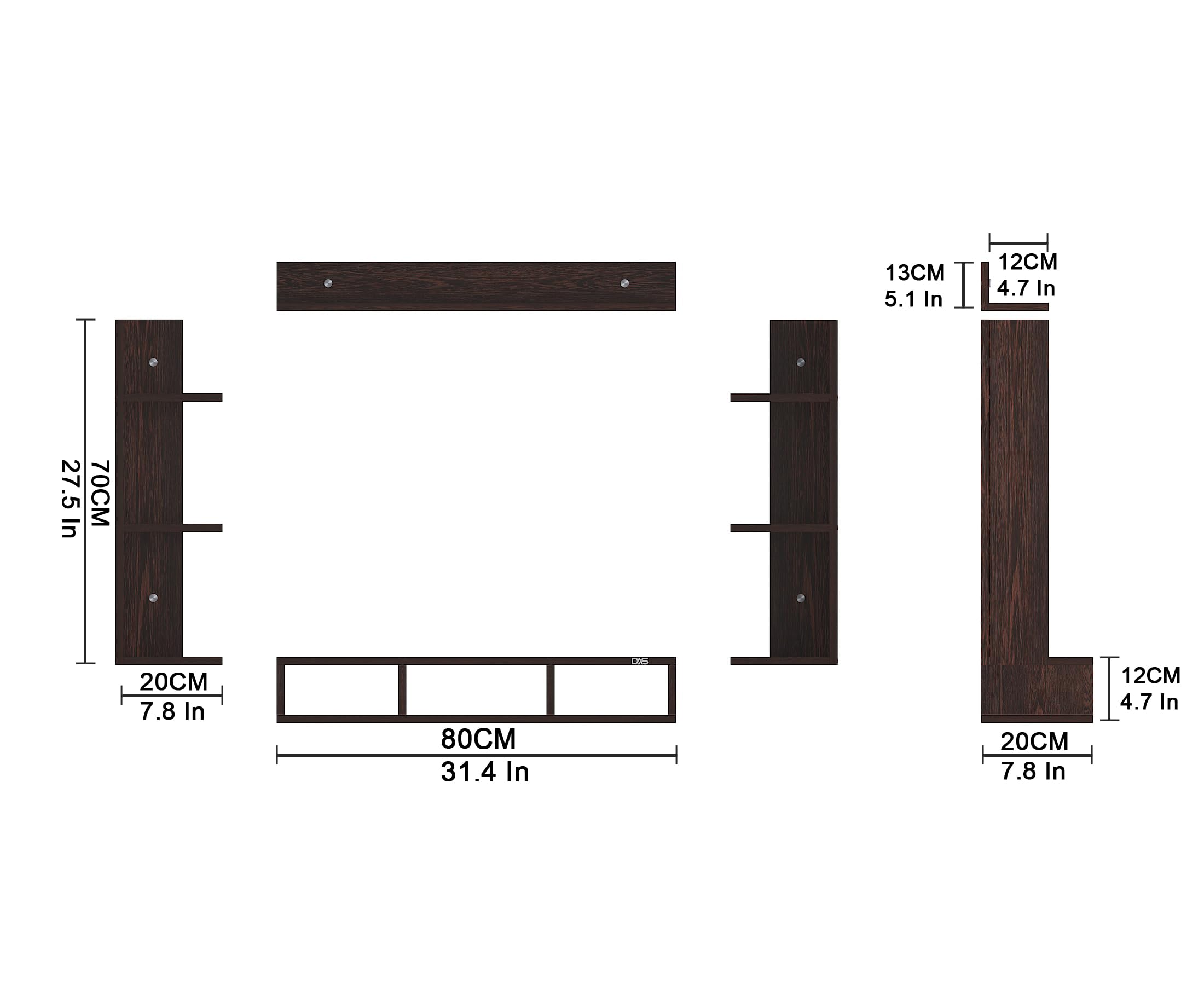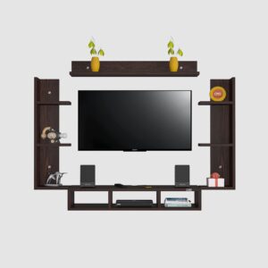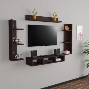 Material- Pre-laminated particle baord. Weight Capacity- 20 KG. Cable Management. Product Dimension- TV Cabinet- 80 x 20 x 15 CM, Wall Shelf- 20 x 12 CM, Shelf supporting Unit- 70 x 12.5 CM, Pop Out Shelf- 80 x 12 cm Weight- 10 KG
