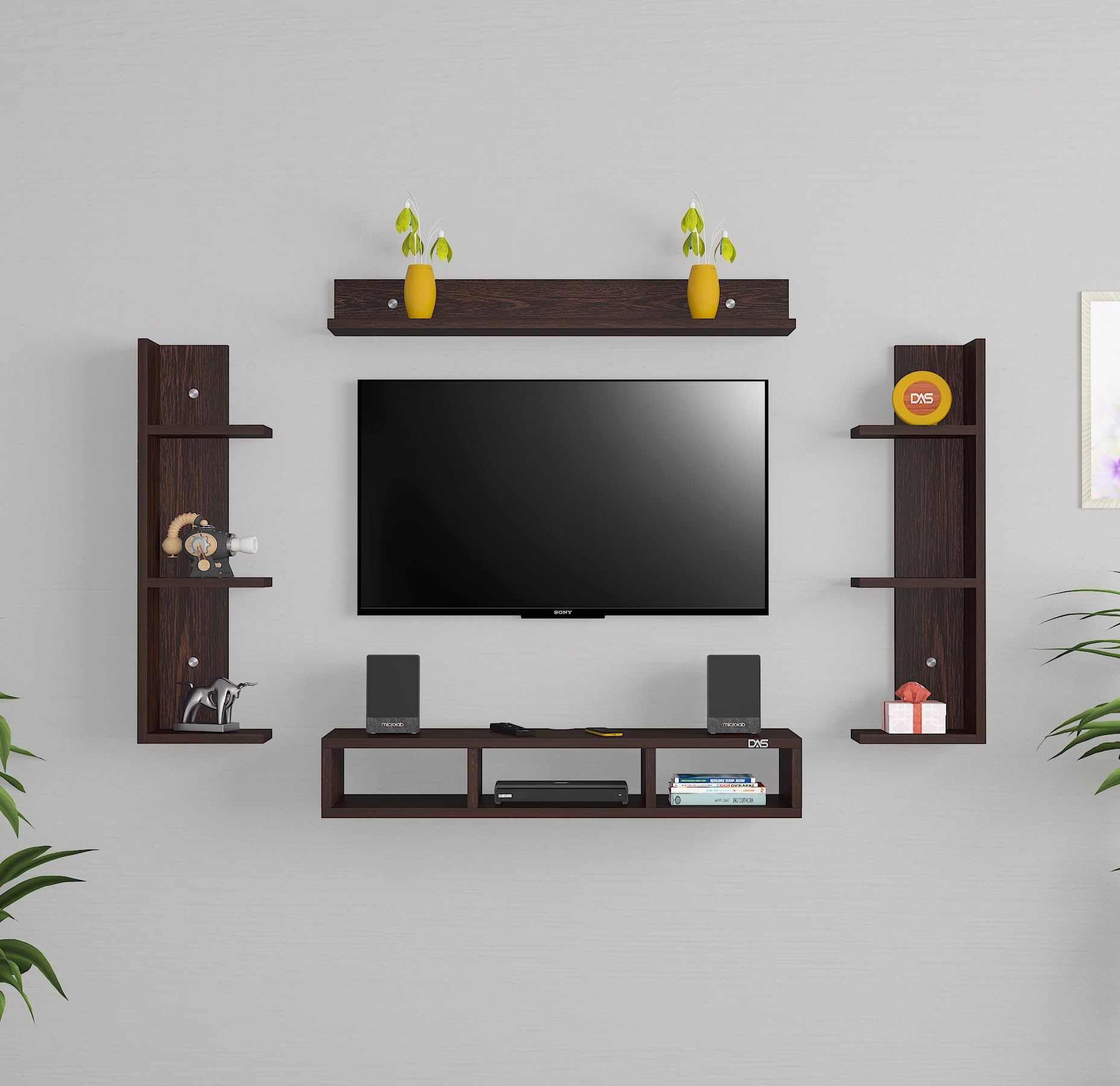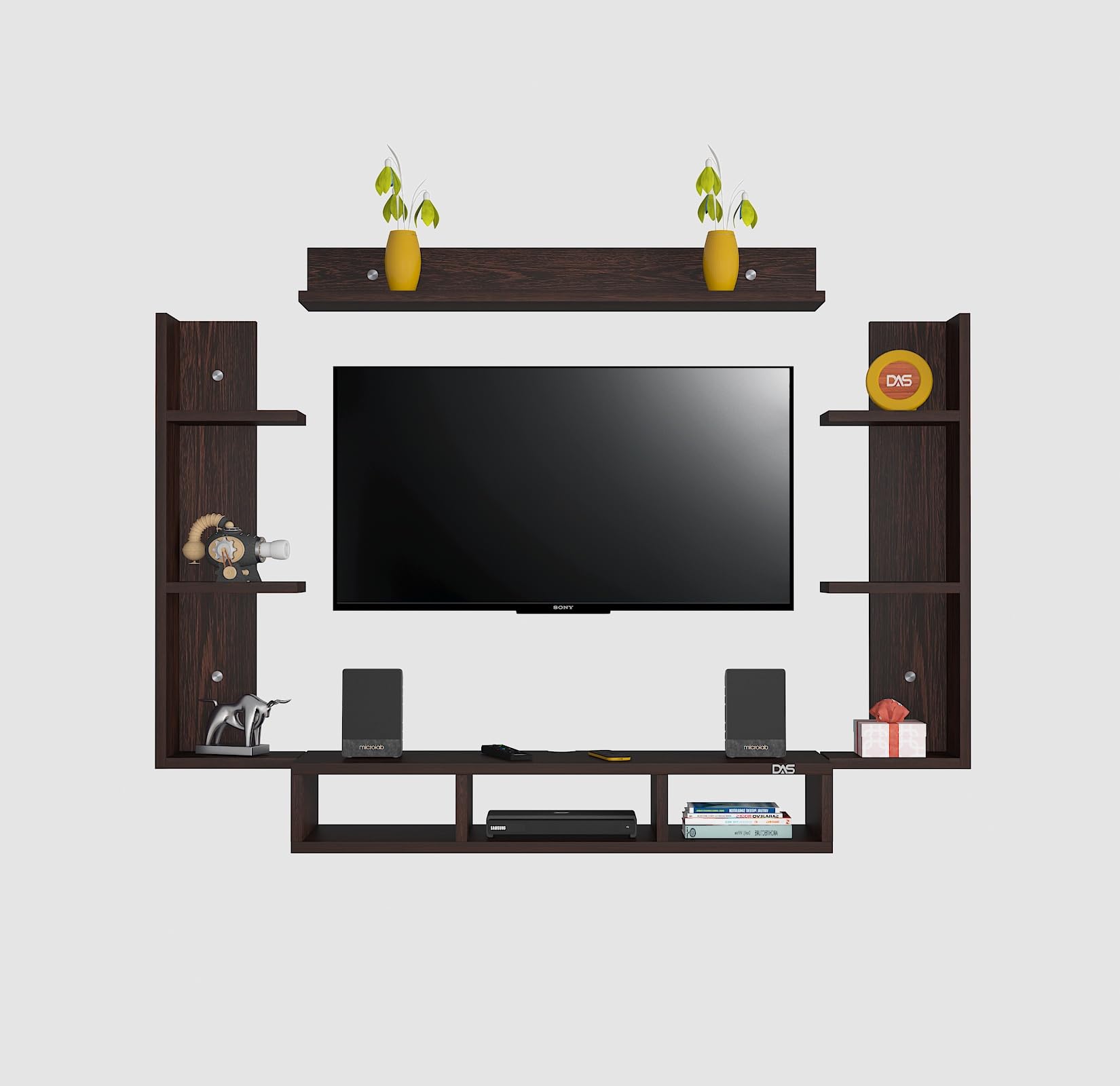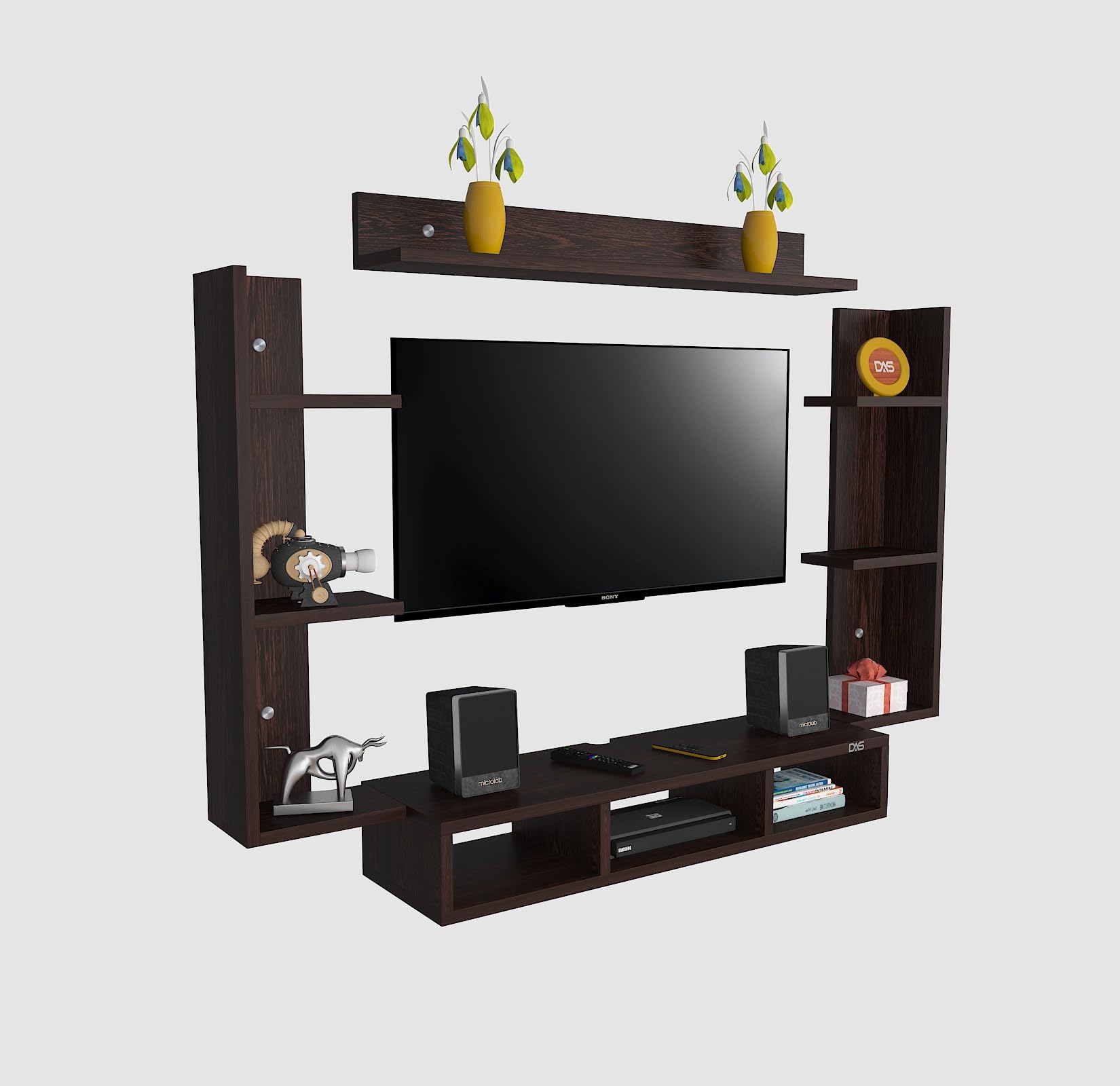 Material- Pre-laminated particle baord. Weight Capacity- 20 KG. Cable Management. Product Dimension- TV Cabinet- 80 x 20 x 15 CM, Wall Shelf- 20 x 12 CM, Shelf supporting Unit- 70 x 12.5 CM, Pop Out Shelf- 80 x 12 cm Weight- 10 KG