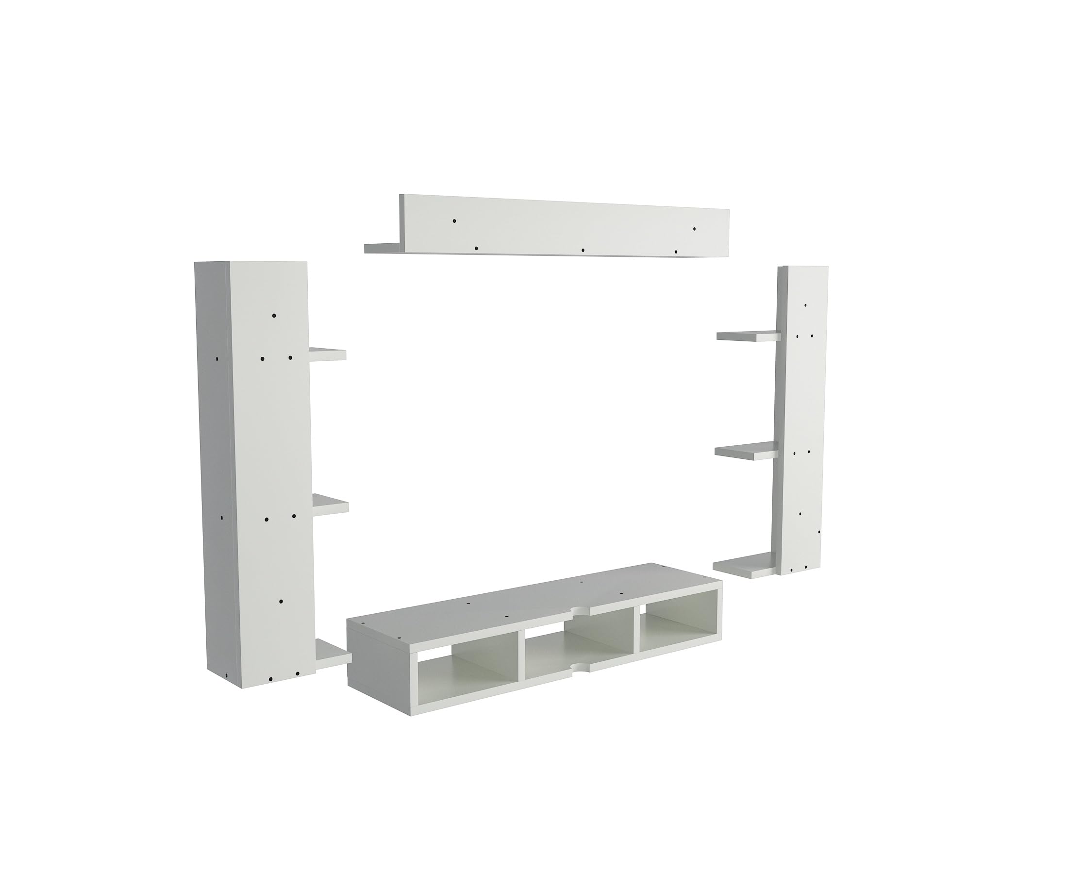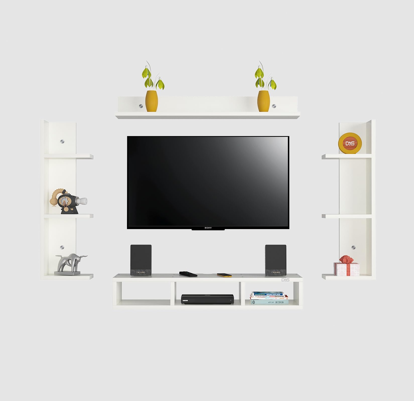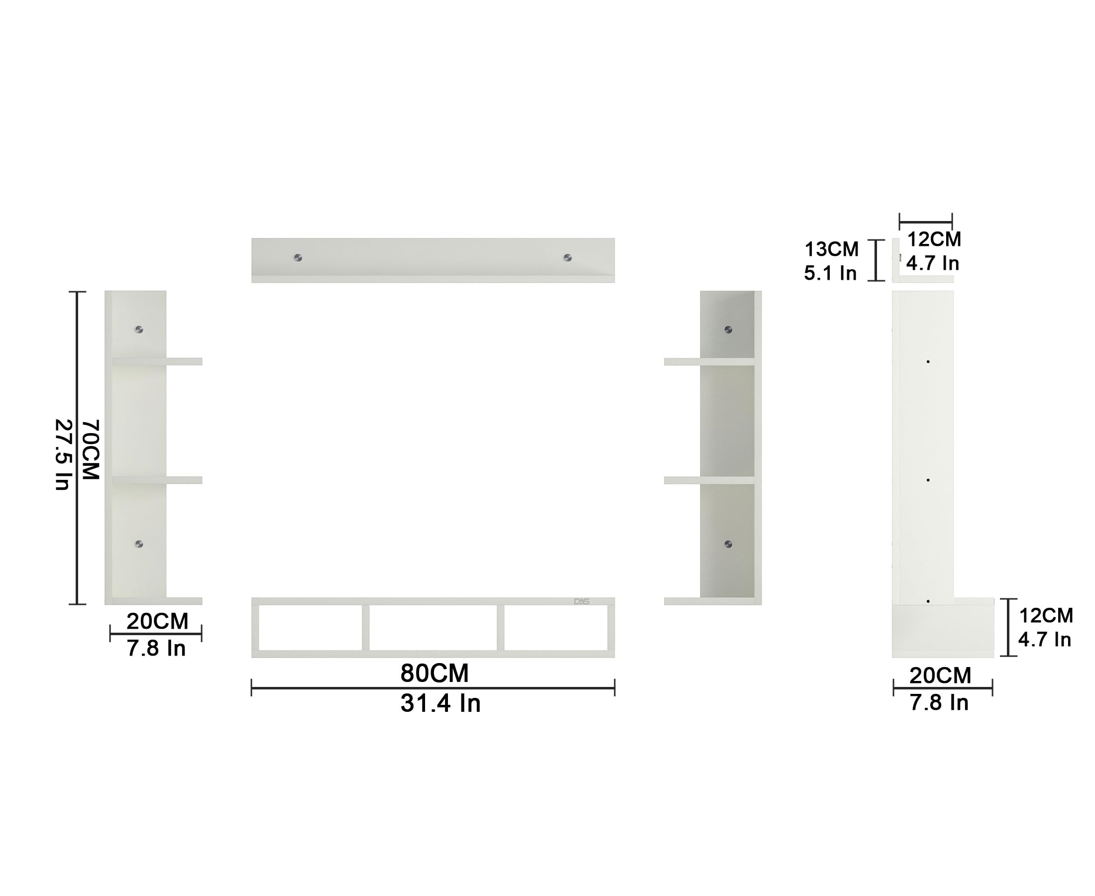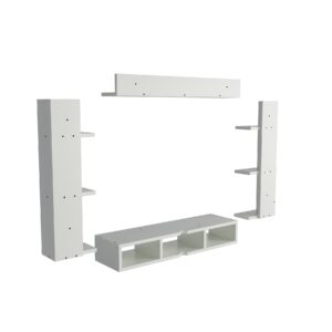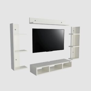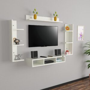 Material- Pre-laminated particle baord. Weight Capacity- 20 KG. Cable Management. Product Dimension- TV Cabinet- 80 x 20 x 15 CM, Wall Shelf- 20 x 12 CM, Shelf supporting Unit- 70 x 12.5 CM, Pop Out Shelf- 80 x 12 cm Weight- 10 KG