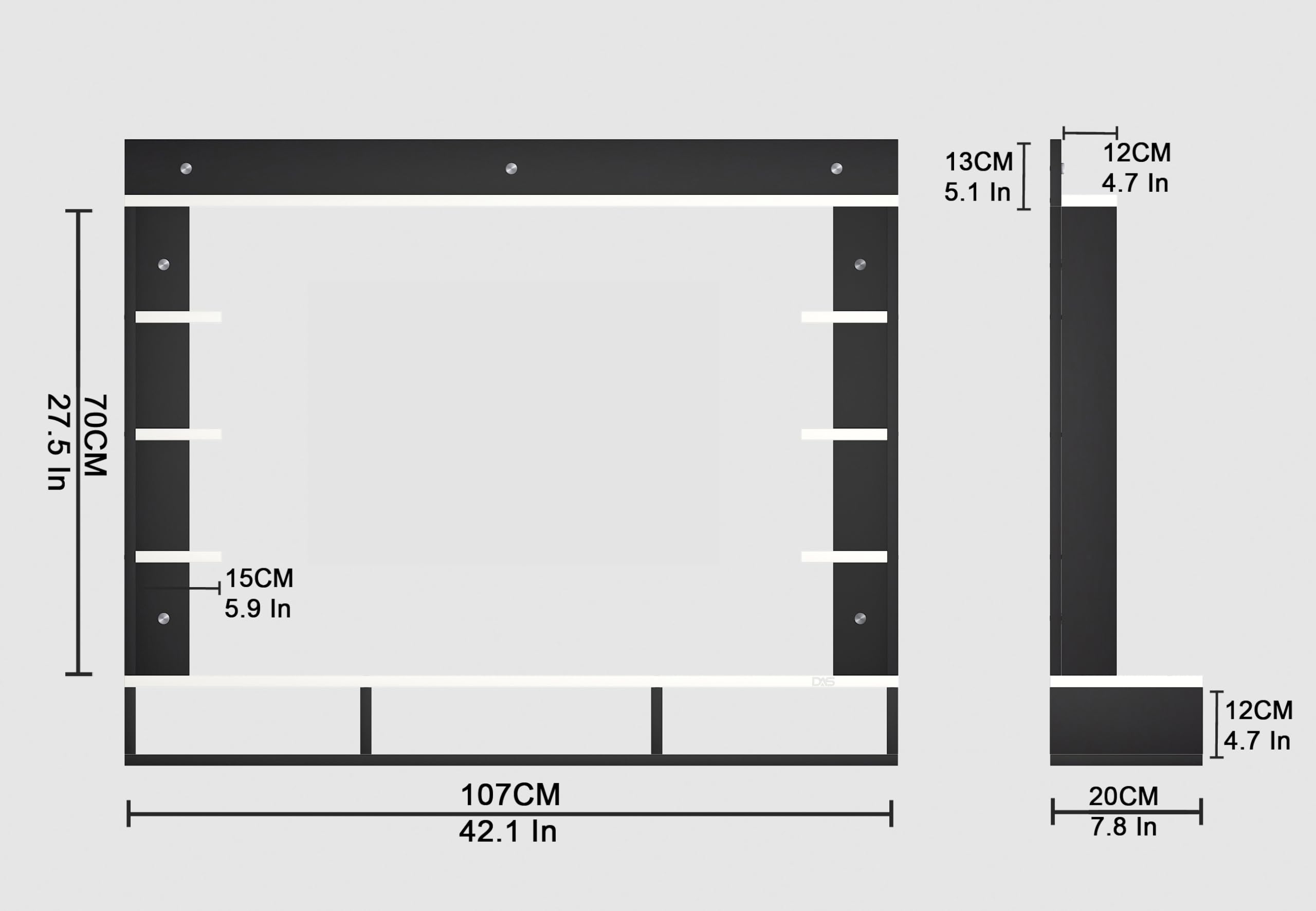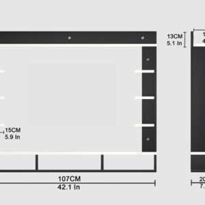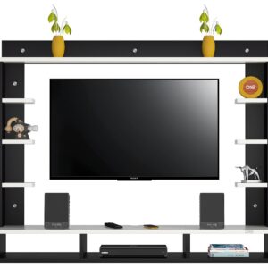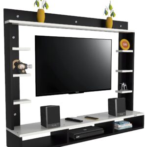 Material- Pre-laminated particle baord. Weight Capacity- 25 KG. Cable Management. Product Dimension- TV Cabinet- 107 x 20 x 15 CM, Wall Shelf- 15 x 12 CM, Shelf supporting Unit- 70 x 13.5 CM, Pop Out Shelf- 107 x 12 cm Weight- 15 KG