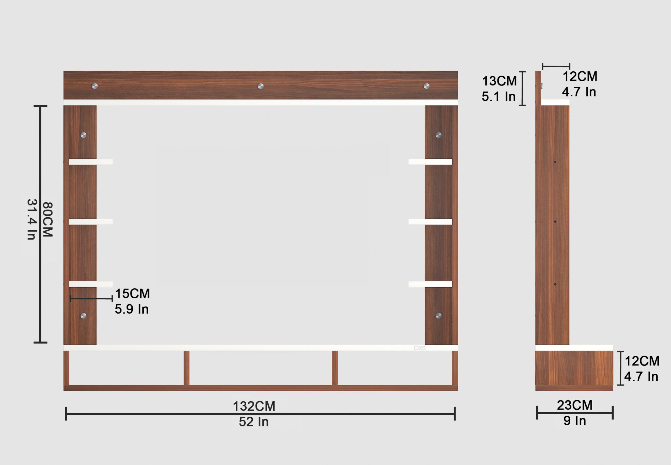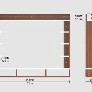 Material- Pre-laminated particle baord. Weight Capacity- 25 KG. Cable Management. Product Dimension- TV Cabinet- 132 x 23 x 15 CM, Wall Shelf- 15 x 12 CM, Shelf supporting Unit- 80 x 13.5 CM, Pop Out Shelf- 132 x 12 cm Weight- 19 KG