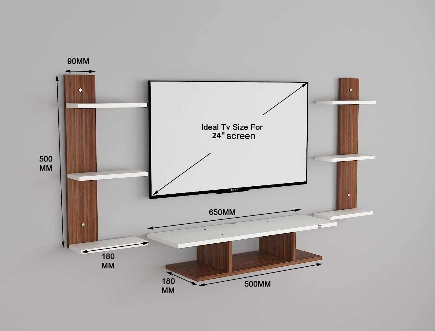 Material- Engineered Wood Product Dimensions- Bottom Unit 65 x 18 & 50 x 18 cm, Wall Shelf- 50 x 9 and 18 x 12 cm, Weight- 6 KG