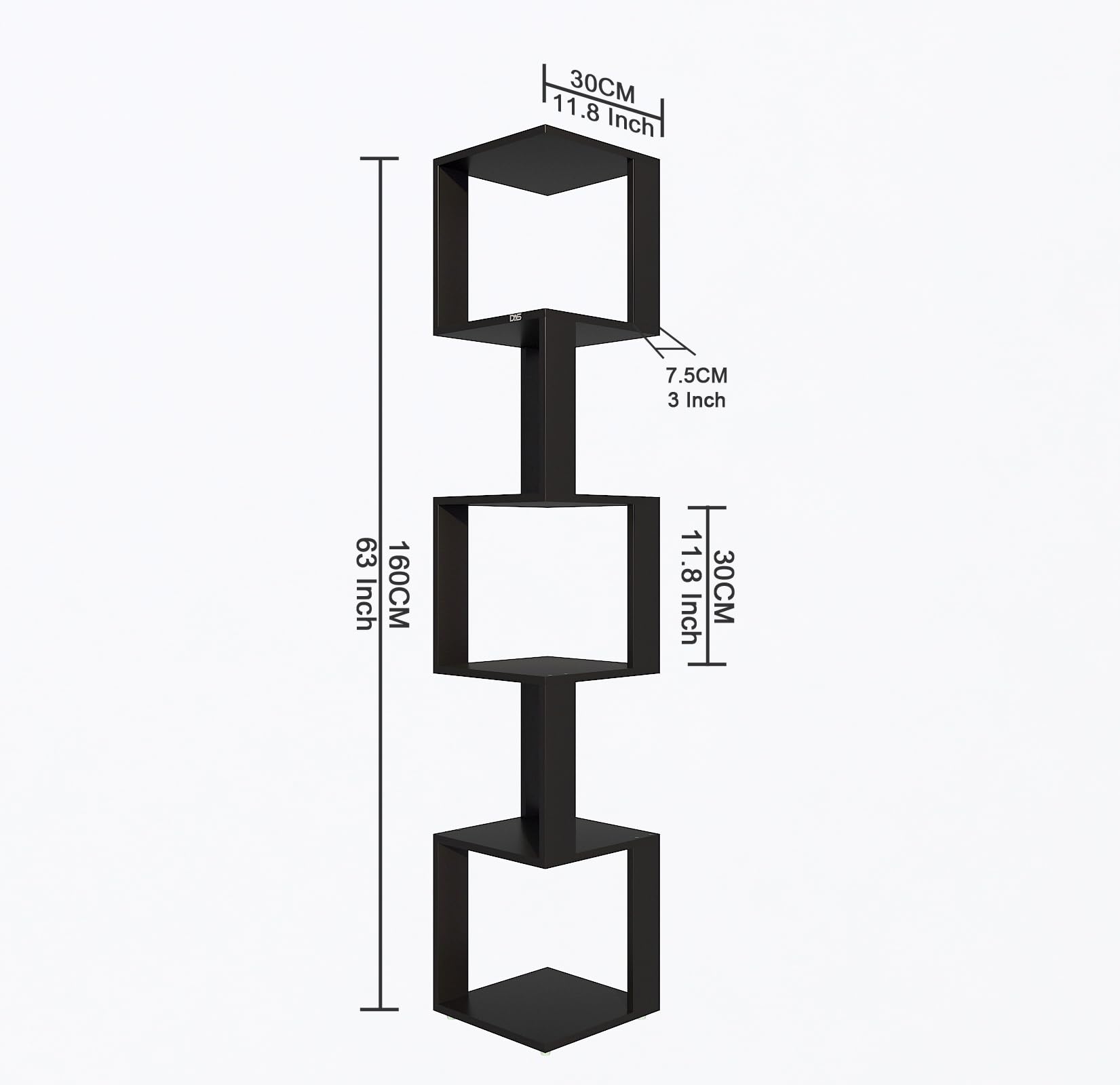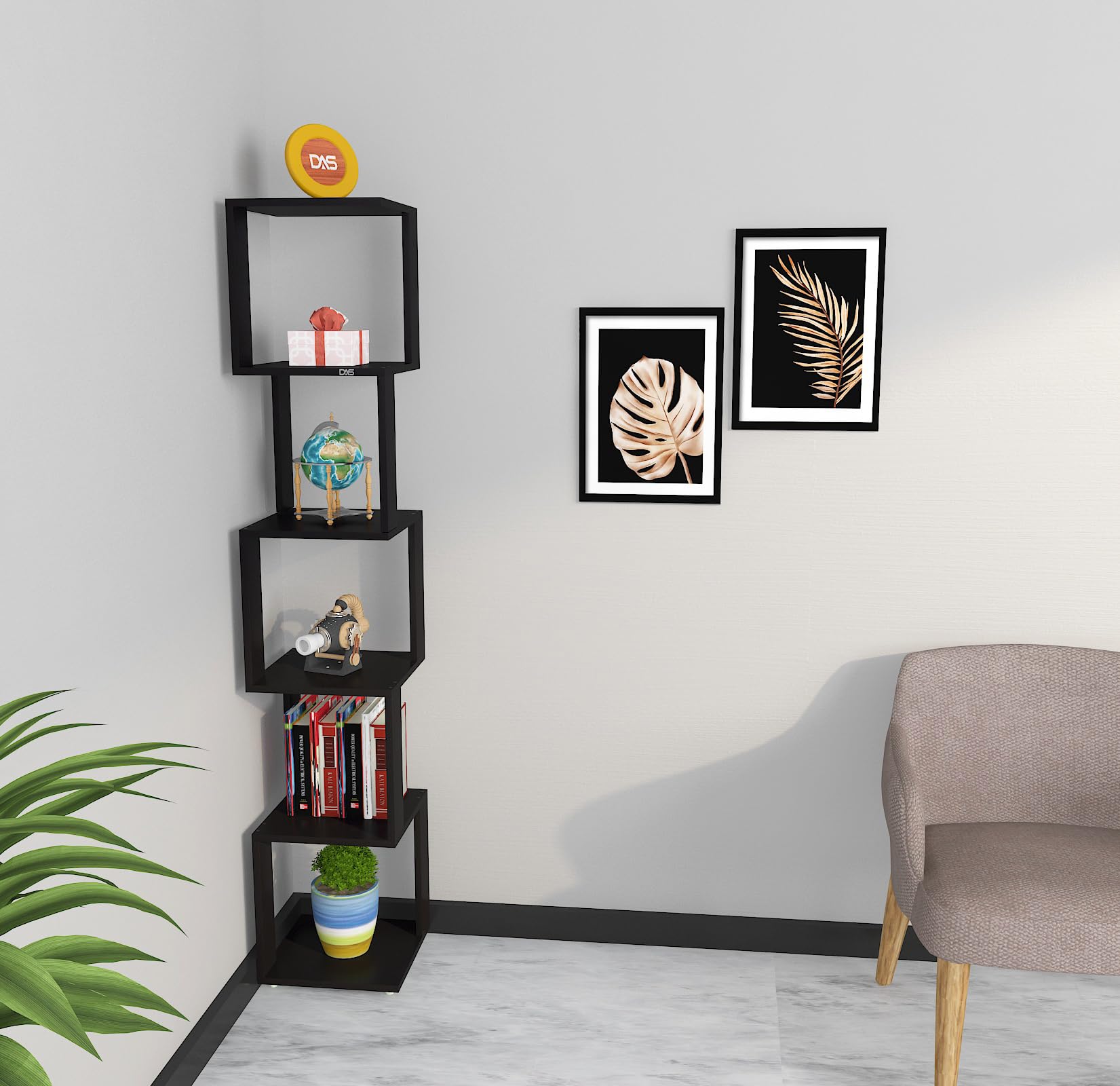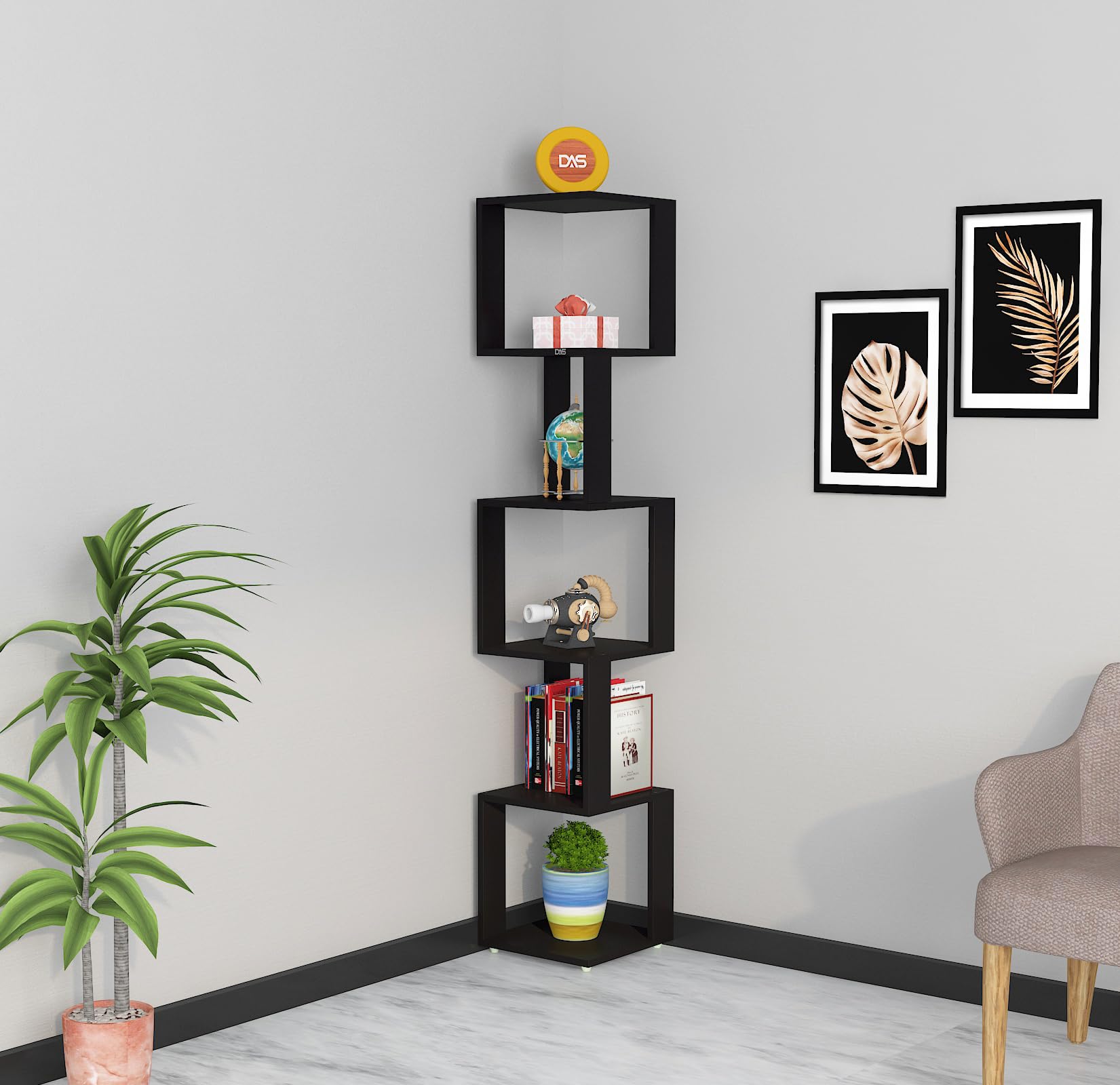 Material- Engineered Wood Color- Black Application- Living Room Product Type- Corner Shelf Number Of Shelves- 6