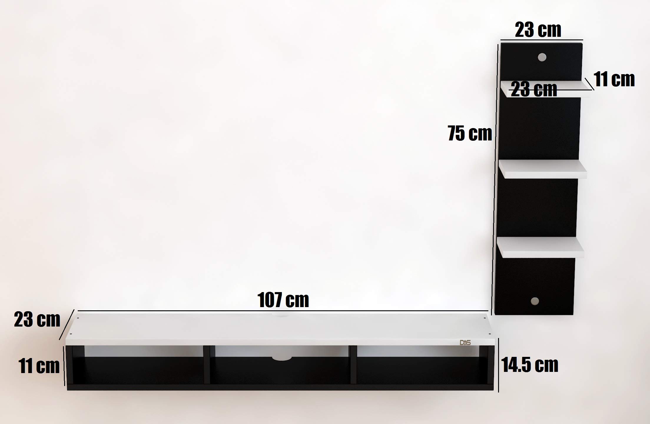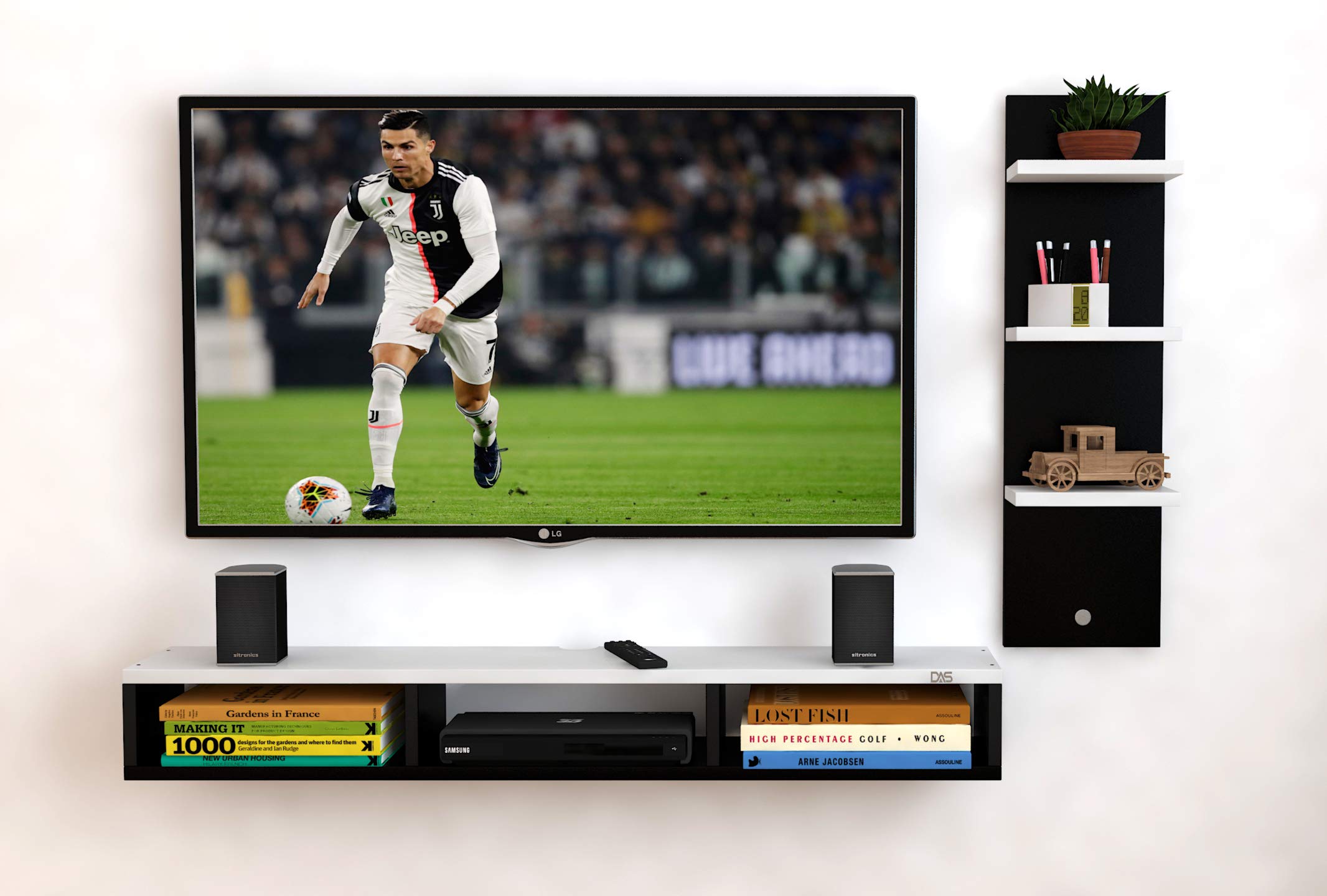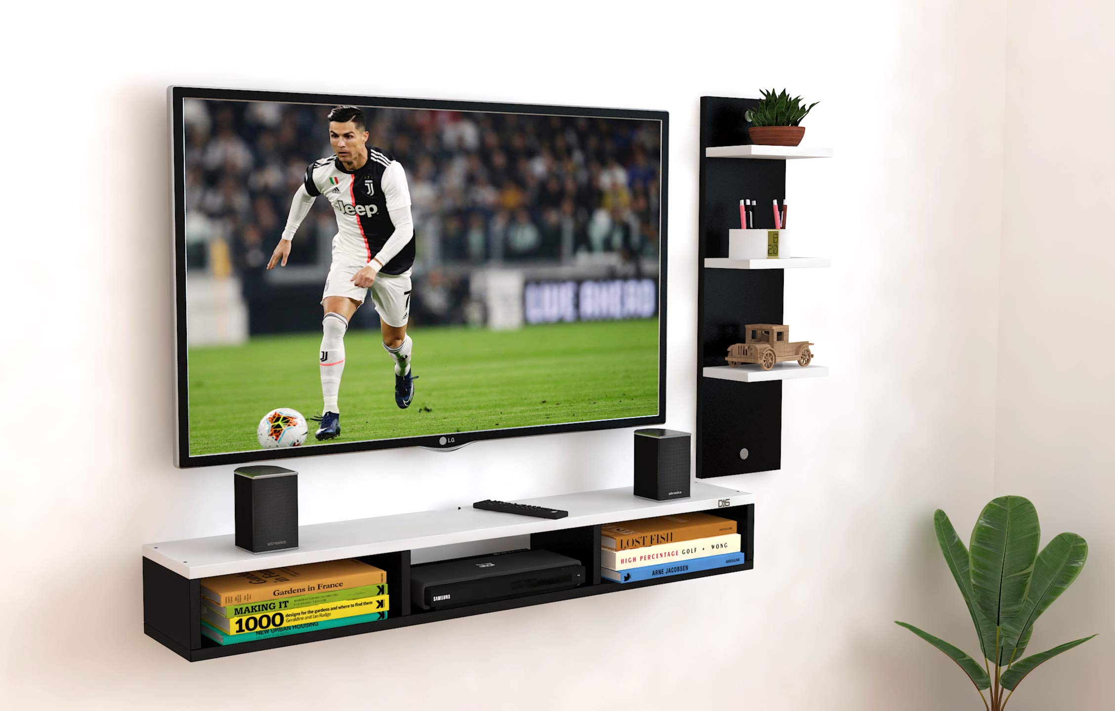 Engineered Wood Wall Mount TV Entertainment Unit with Set Top Box Stand and 3 Wall Shelves , Ideal for up to 48″ Screen- Bolivar (Black , White)