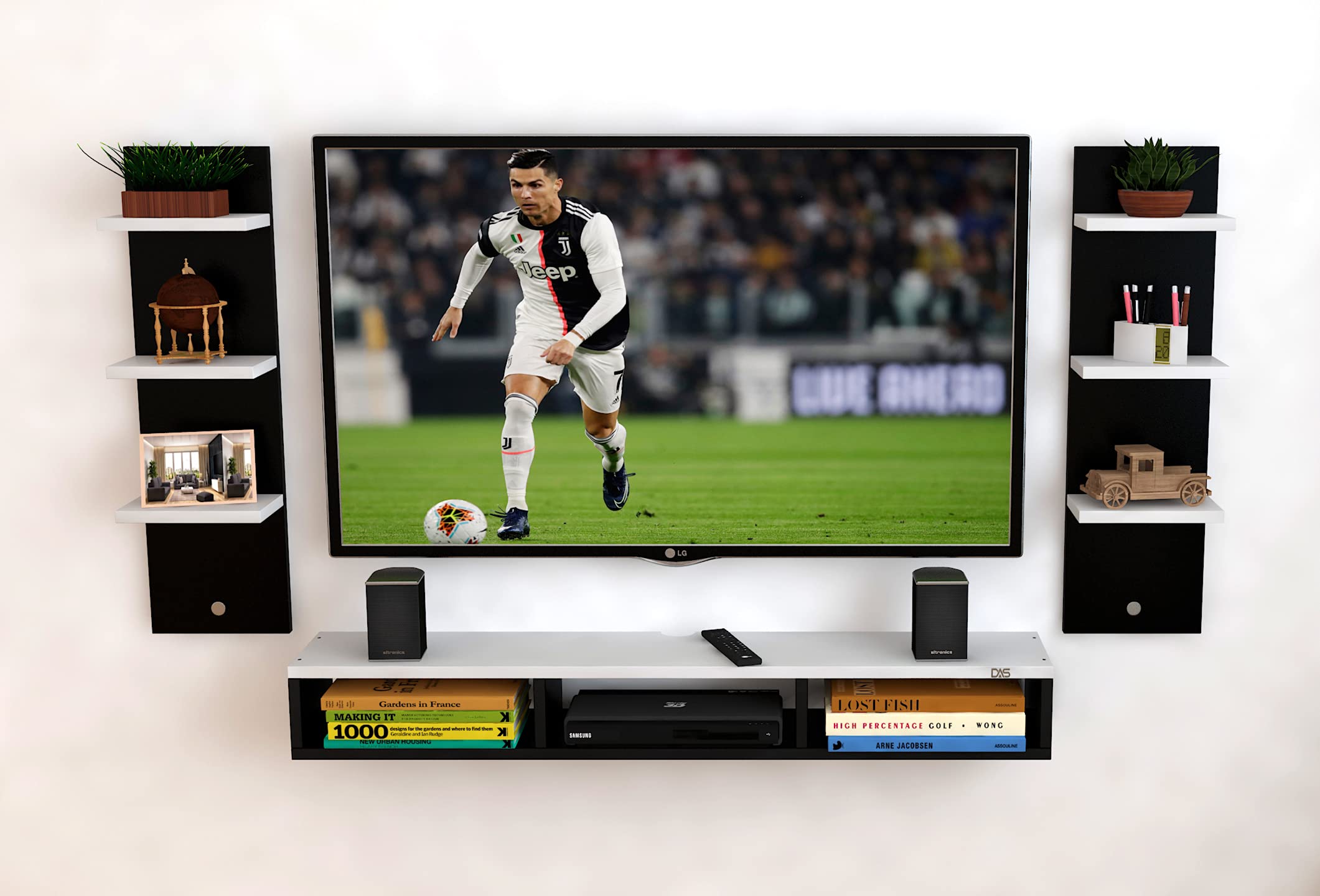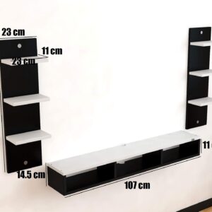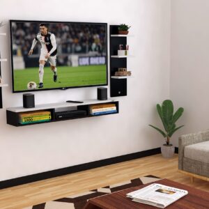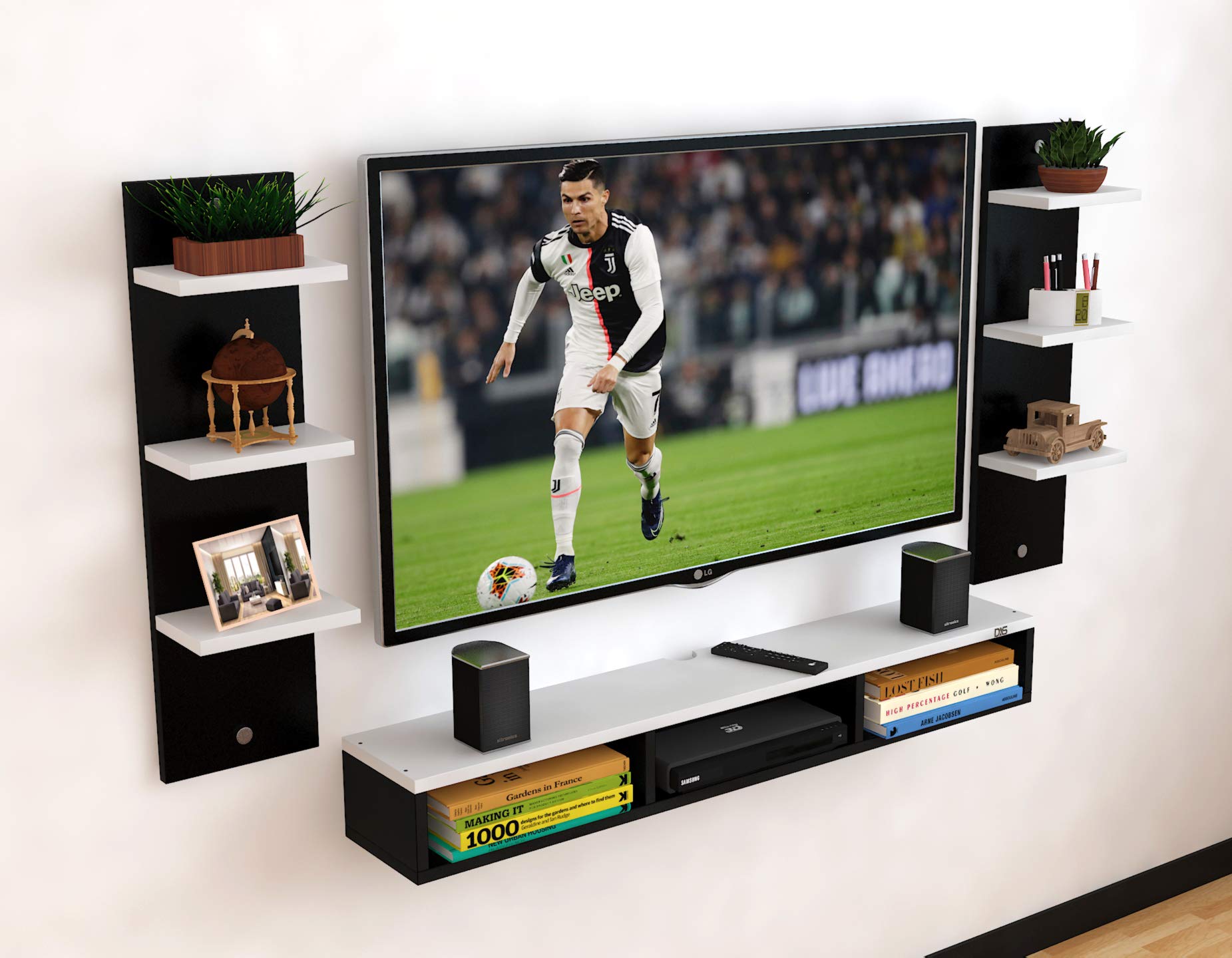 Engineered Wood Wall Mount TV Entertainment Unit with Set Top Box Stand and 6 Wall Shelves – Ideal for up to 48″ (Black and White )