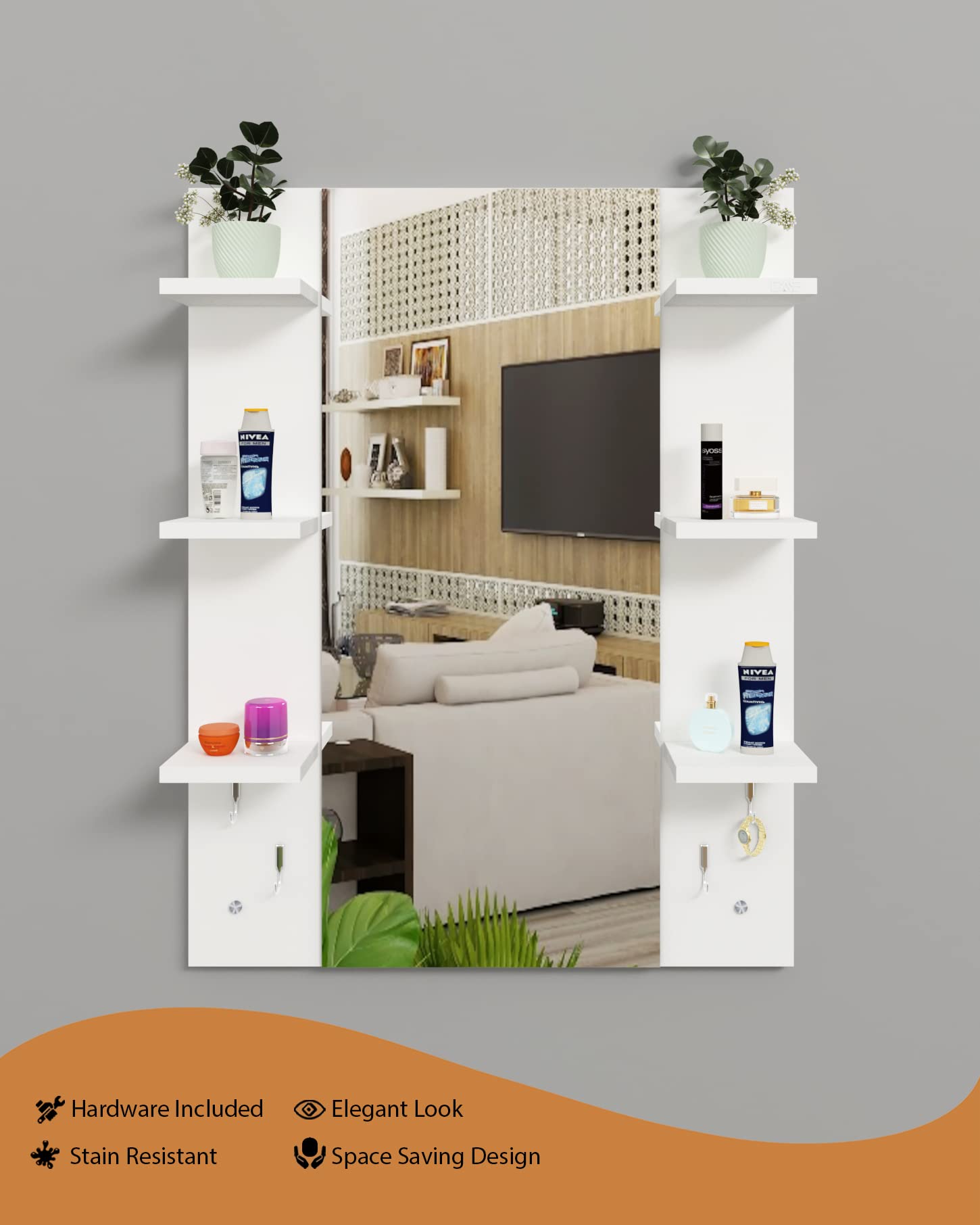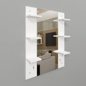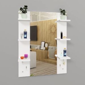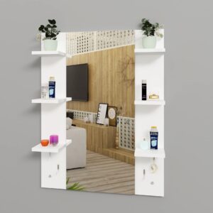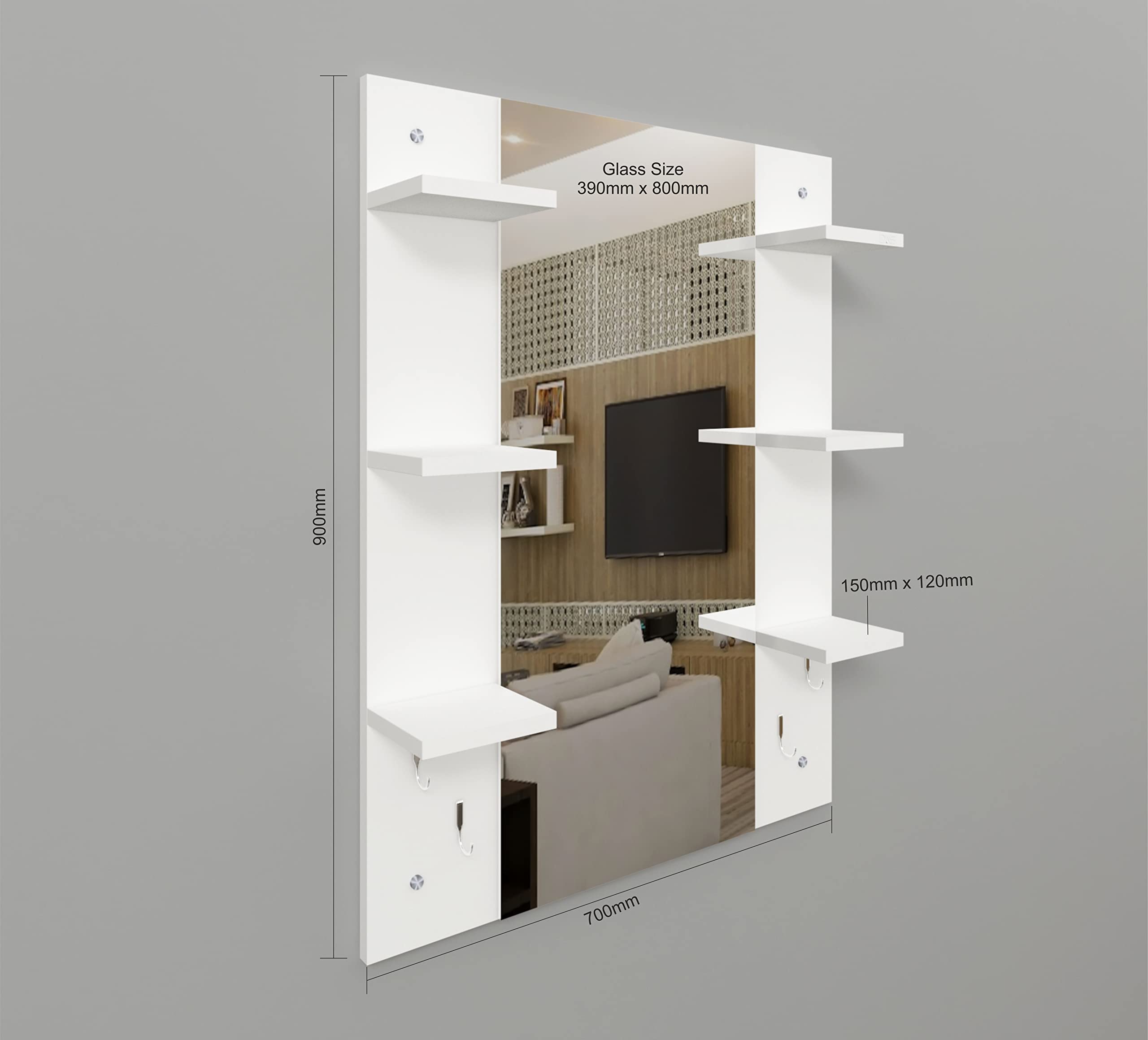 Material- Engineered Wood, Glass and Stainless Steel. Product Dimensions- Wooden Frame- 90 x 70 cm, Mirror- 89.5 x 39 cm. Weight- 13.5 kg.