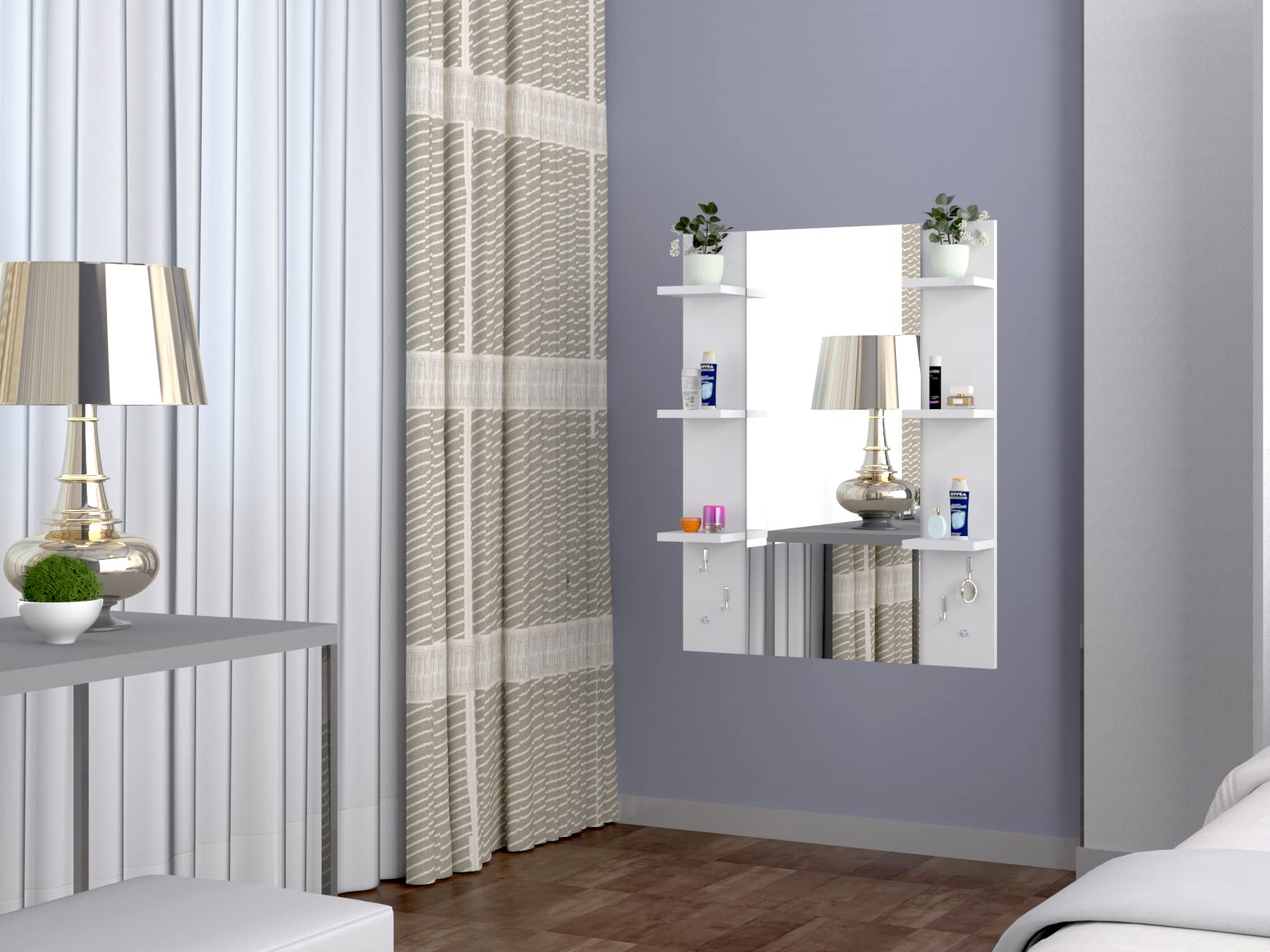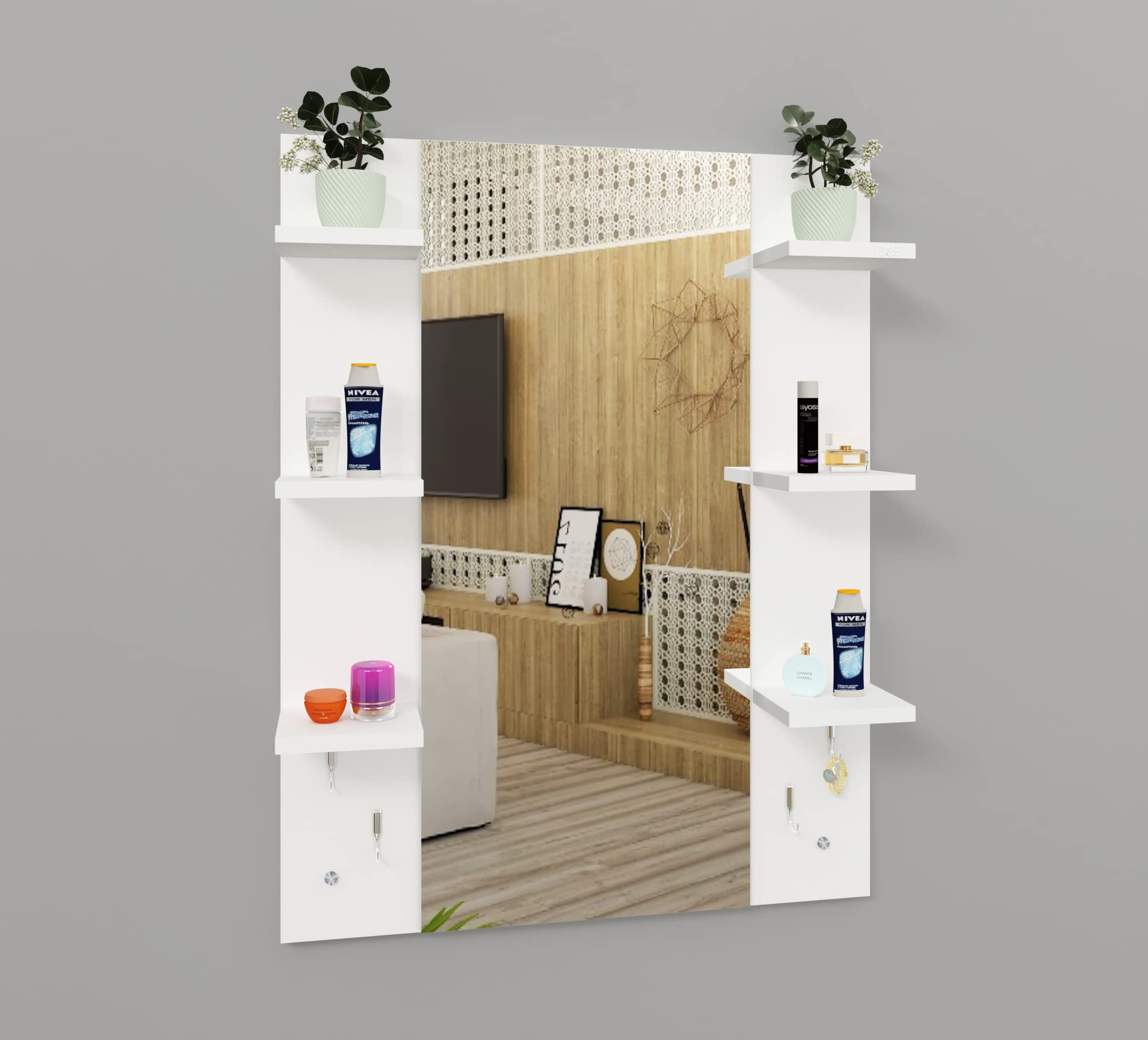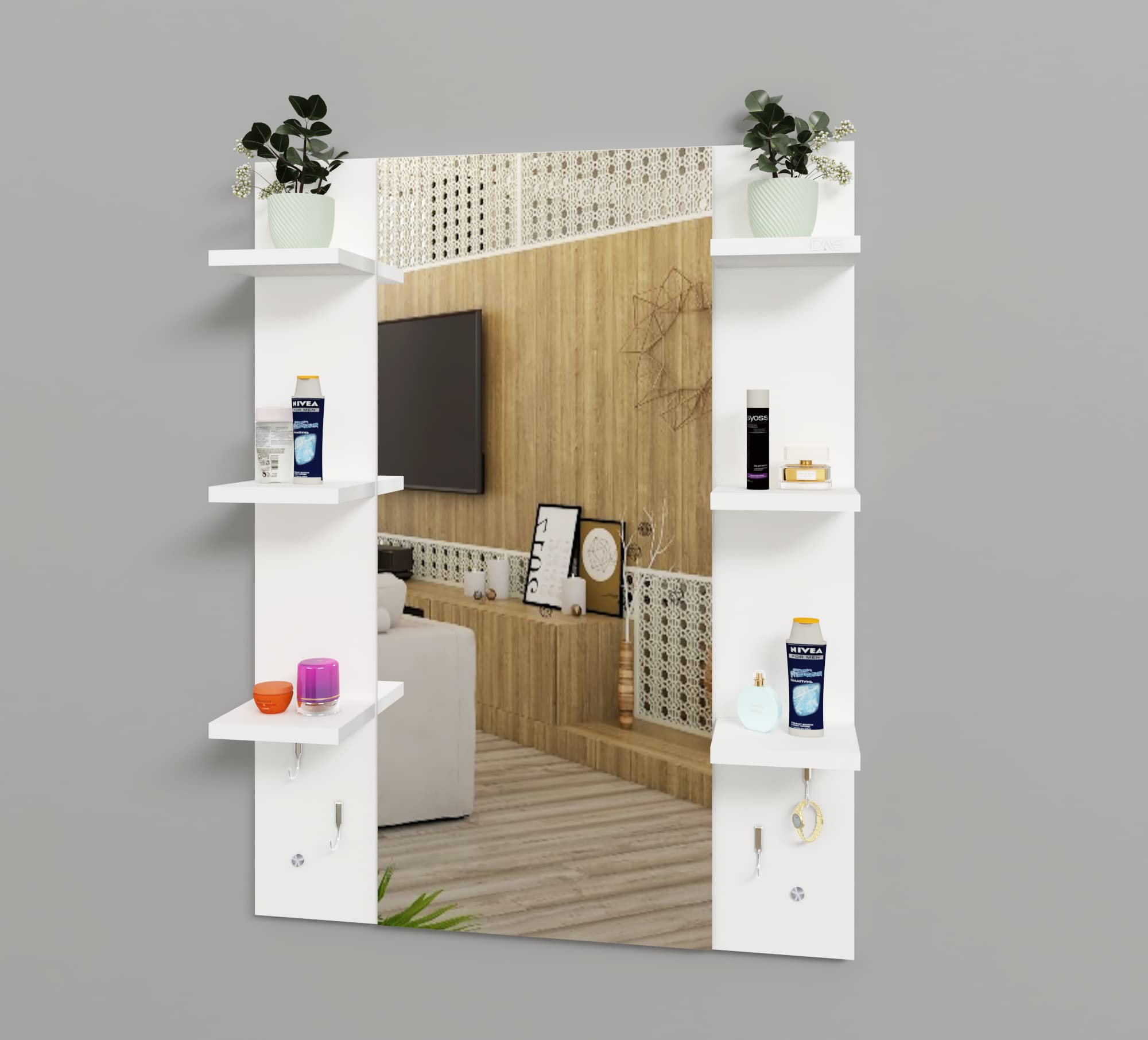Material- Engineered Wood, Glass and Stainless Steel. Product Dimensions- Wooden Frame- 90 x 70 cm, Mirror- 89.5 x 39 cm. Weight- 13.5 kg.