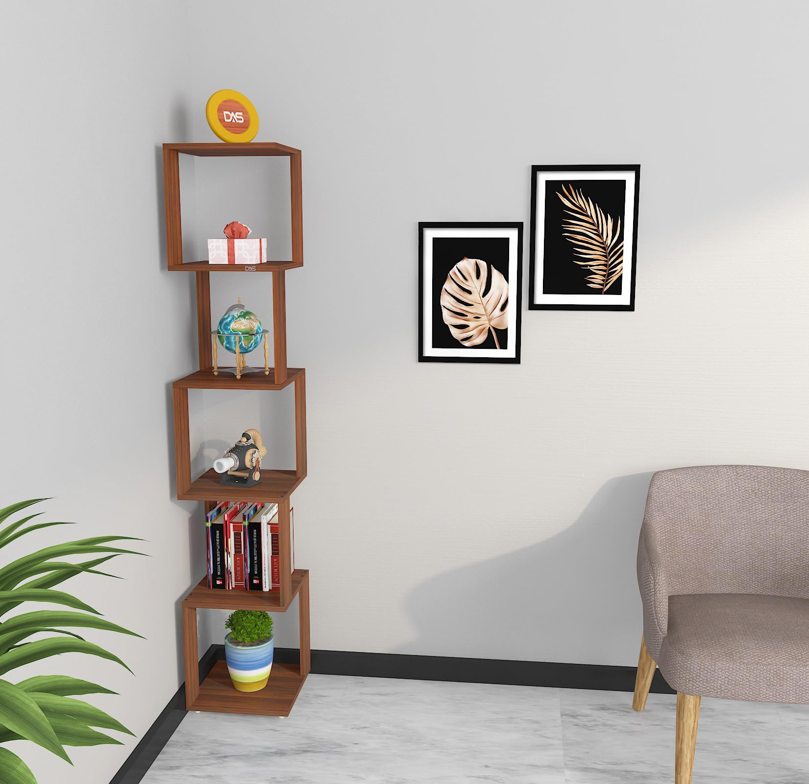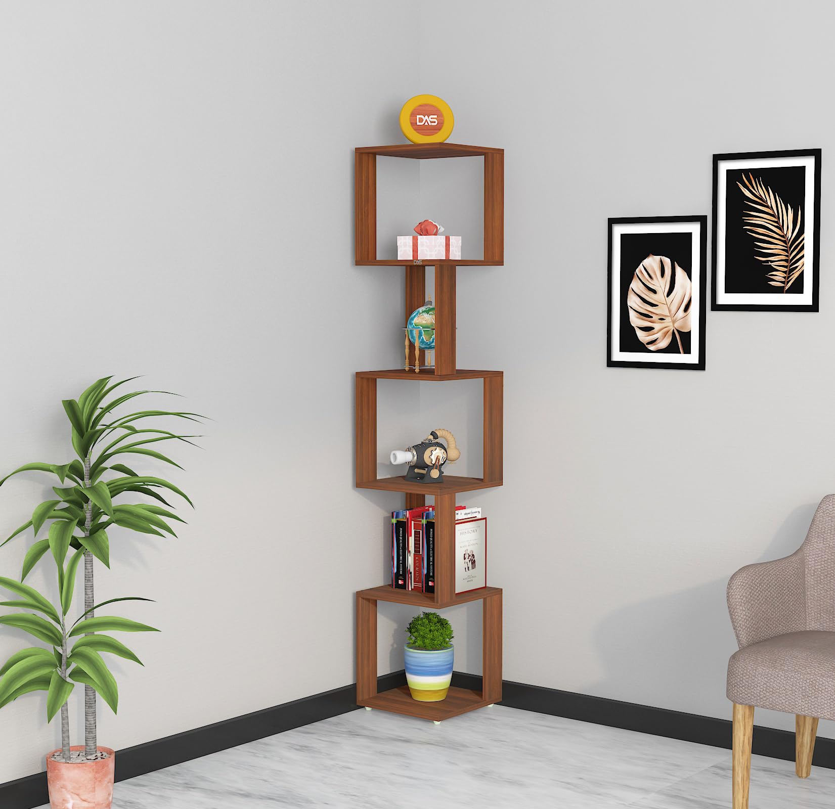 Material- Engineered Wood Color- Classic Walnut Application- Living Room Product Type- Corner Shelf Number Of Shelves- 6
