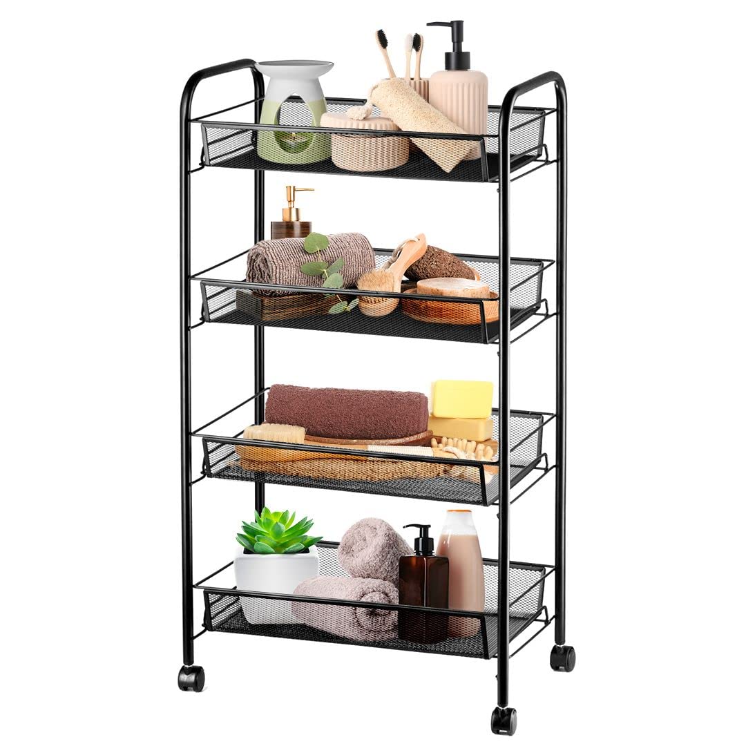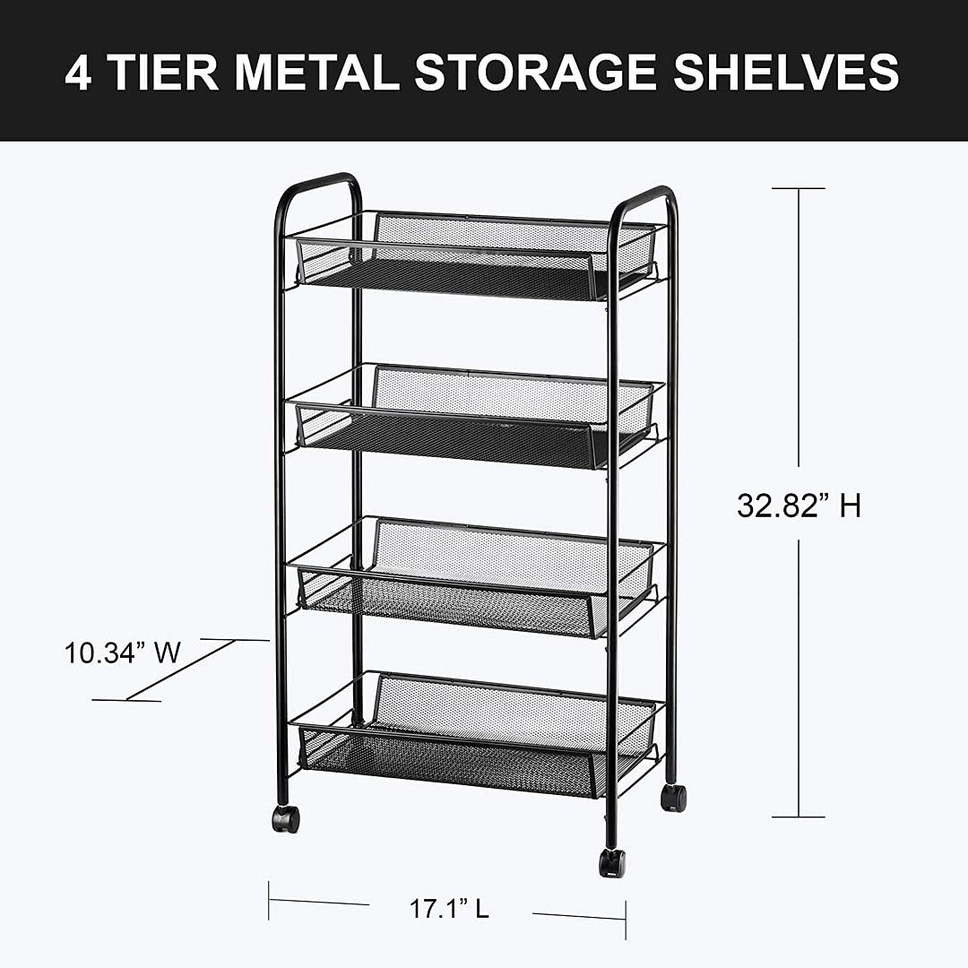 Halter 4-Tier Rolling Basket Stand, Full Metal Rolling Trolley for Kitchen & Bathroom – Four Tier Storage Cart w/Shelves & Wheels – 33” X 17.25” – Black