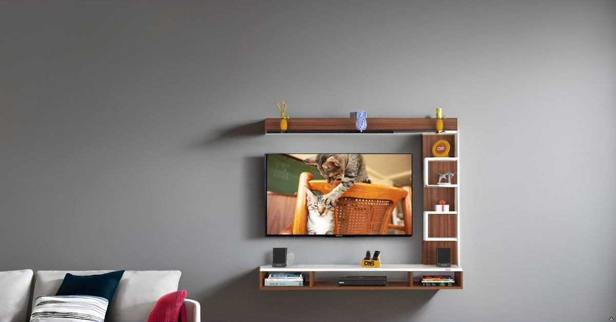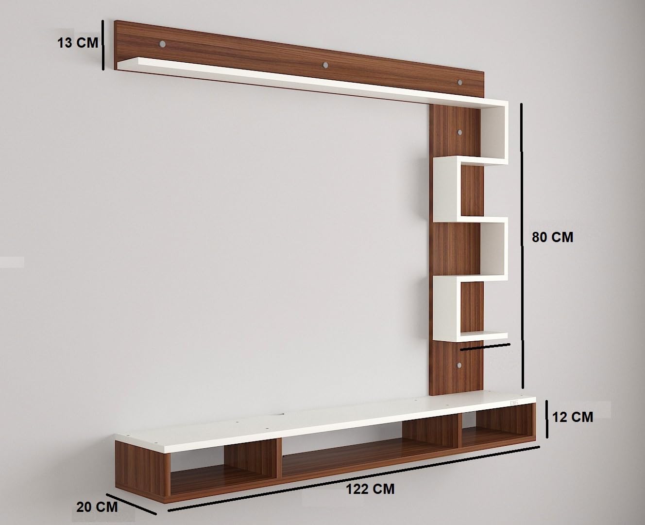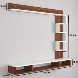 Material- Pre-laminated particle baord. Weight Capacity- 20 KG. Cable Management. Product Dimension- TV Cabinet- 122 x 20 x 15 CM, Wall Shelf- 20 x 12 CM, Shelf supporting Unit- 80 x 20 CM, Pop Out Shelf- 122 x 12 cm Weight- 9.5 KG