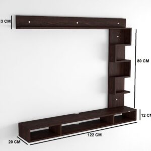 Material- Pre-laminated particle baord. Weight Capacity- 20 KG. Cable Management. Product Dimension- TV Cabinet- 122 x 20 x 15 CM, Wall Shelf- 20 x 12 CM, Shelf supporting Unit- 80 x 20 CM, Pop Out Shelf- 122 x 12 cm Weight- 9.5 KG