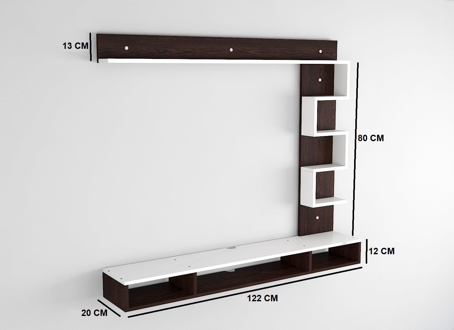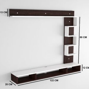 Material- Pre-laminated particle baord. Weight Capacity- 20 KG. Cable Management. Product Dimension- TV Cabinet- 122 x 20 x 15 CM, Wall Shelf- 20 x 12 CM, Shelf supporting Unit- 80 x 20 CM, Pop Out Shelf- 122 x 12 cm Weight- 9.5 KG
