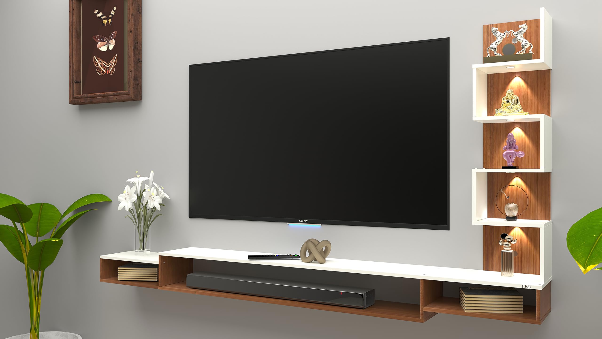 JORDANE LED Light Installed Wall Mount Engineered Wood TV Entertainment Unit/Tv Rack with Wall Shelves for Living Room Classic Walnut & Frosty White (Ideal for up to 55″) Screen
