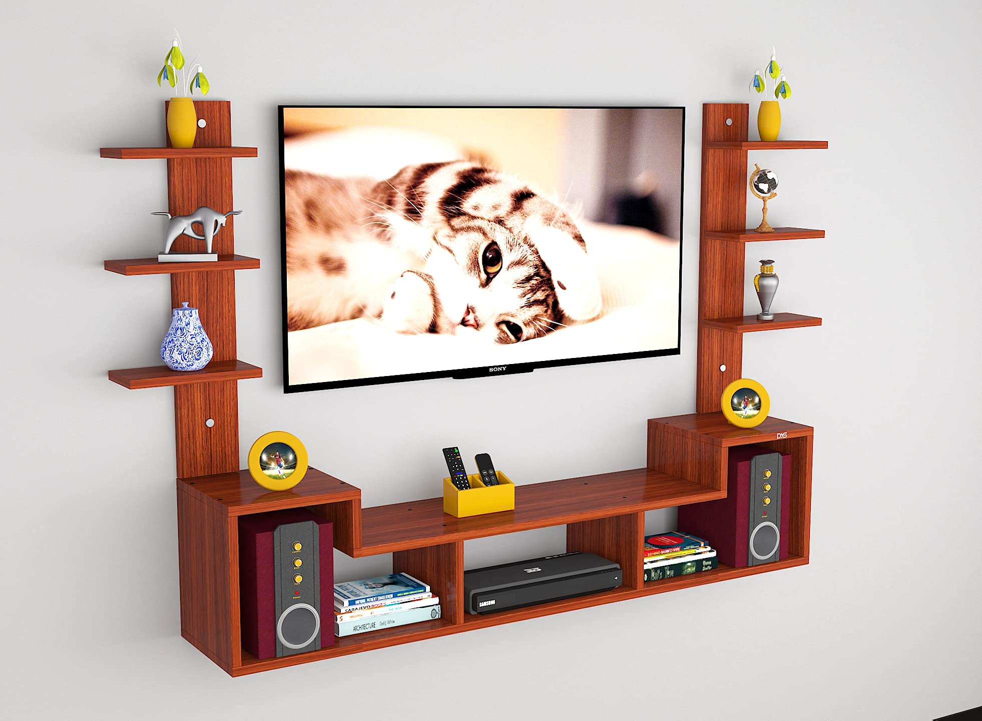 Upgrade your living space with the DAS Konrad Wall Mount TV Entertainment Unit, a perfect blend of functionality, durability, and modern design. Crafted from premium engineered wood in a rich Classic Walnut finish, this entertainment unit is ideal for TVs up to 43 inches, making it a versatile choice for compact and medium-sized living rooms, bedrooms, or office setups. The unit features a dedicated set top box stand along with six spacious wall shelves, offering ample space to display books, photo frames, decorative accents, or everyday essentials. Its wall-mounted design not only saves valuable floor space but also gives your interiors a clean, uncluttered look. Built with precision and high-quality materials, the DAS Konrad unit is sturdy, scratch-resistant, and designed to last. Its elegant walnut shade complements both traditional and contemporary dΓ©cor, adding a touch of sophistication to your walls. Easy to install and maintain, this entertainment unit is the perfect solution for organizing your TV area while enhancing the overall aesthetic of your room. Whether you want a functional media center or a stylish display rack, the DAS Konrad Wall Mount TV Entertainment Unit is the smart choice for your home.