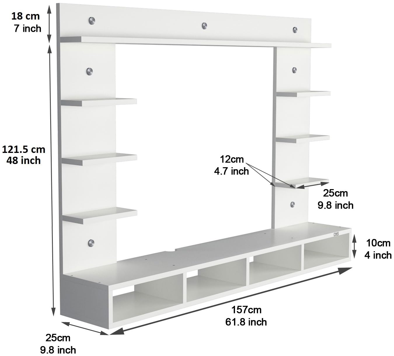 Material- 17mm Pre-laminated particle baord. Weight Capacity- 25 KG. Cable Management. Product Dimension- TV Cabinet- 157 x 25 x 13.4 CM, Wall Shelf- 25 x 12 CM, Shelf supporting Unit- 90 x 25 CM, Pop Up Shelf- 157 x 18 CM & 157 x 12 CM. Thickness Of Board- 17 MM, Weight- 21 KG