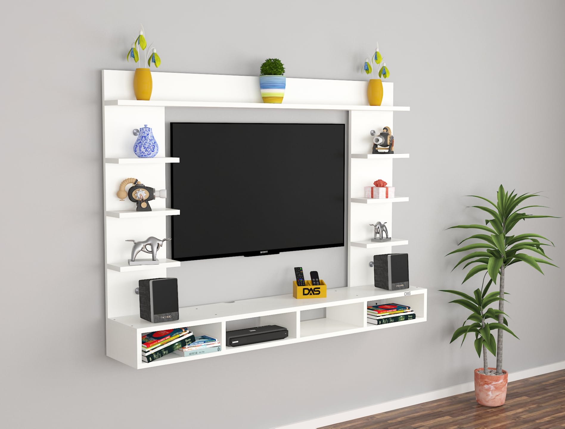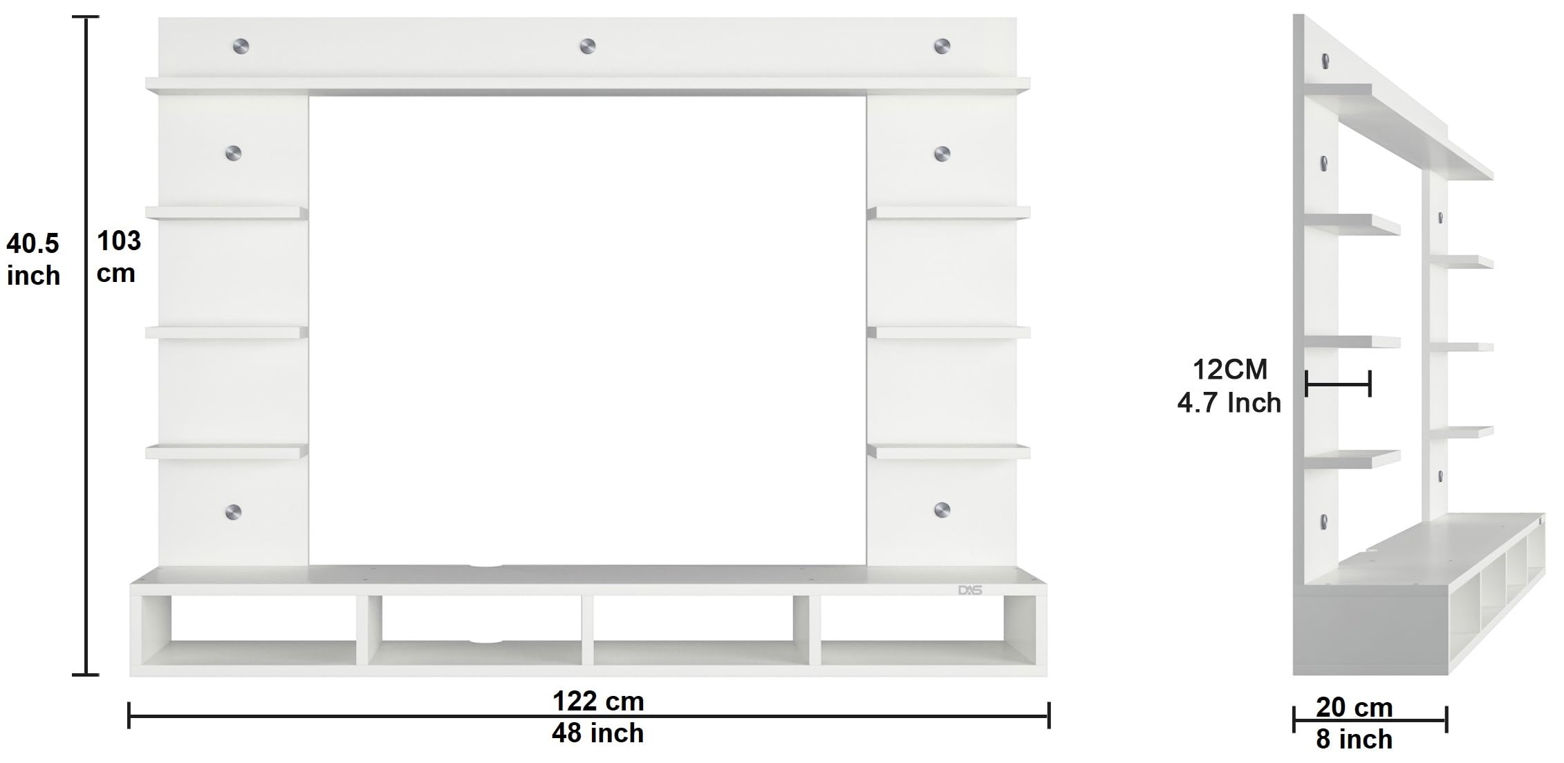 Material- Pre-laminated particle baord. Weight Capacity- 20 KG. Cable Management. Product Dimension- TV Cabinet- 122 x 20 x 15 CM, Wall Shelf- 20 x 12 CM, Shelf supporting Unit- 75 x 20 CM, Pop Out Shelf- 122 x 12 cm Weight- 12 KG
