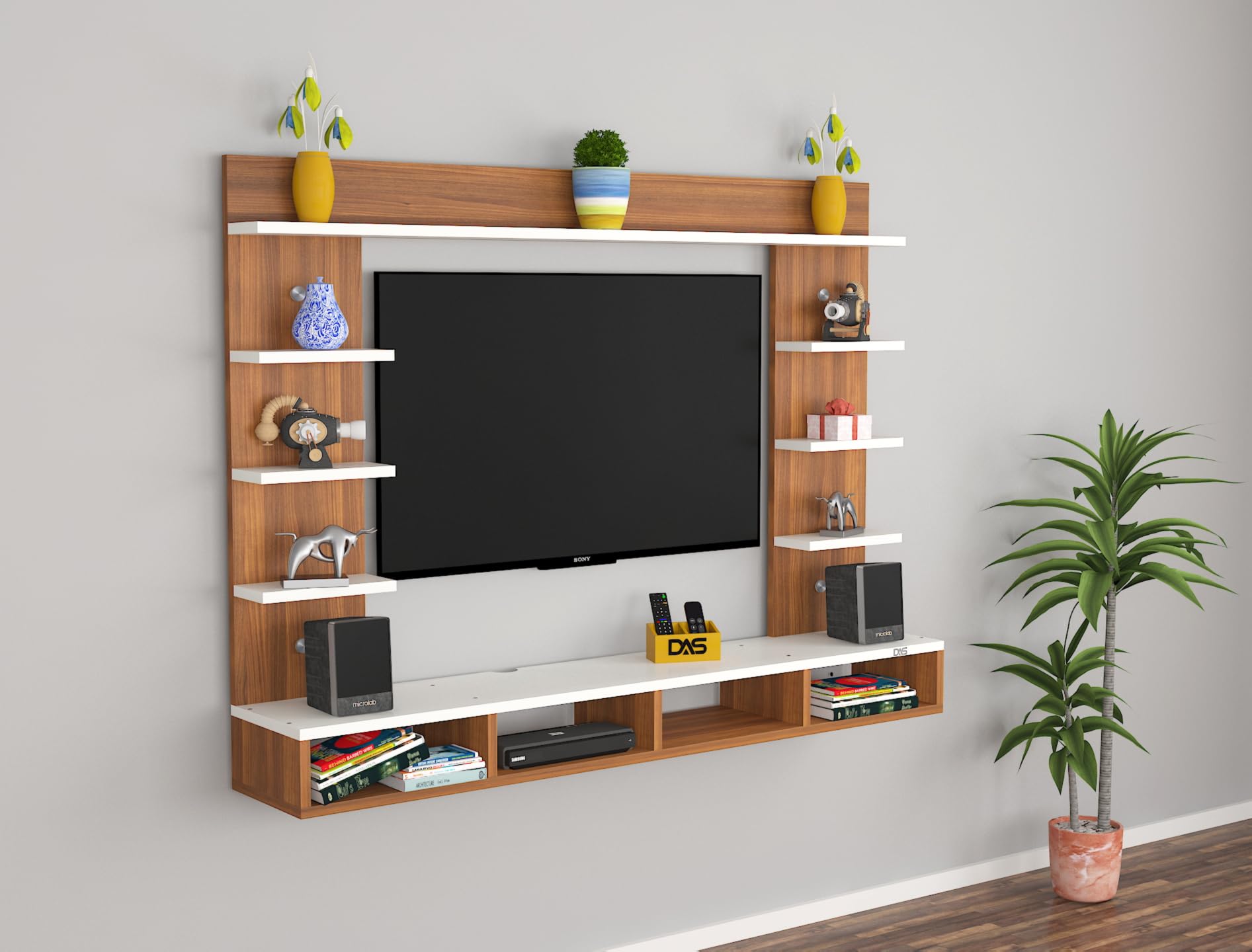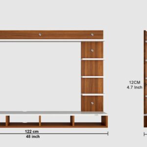 Material- Pre-laminated particle baord. Weight Capacity- 20 KG. Cable Management. Product Dimension- TV Cabinet- 122 x 20 x 15 CM, Wall Shelf- 20 x 12 CM, Shelf supporting Unit- 75 x 20 CM, Pop Out Shelf- 122 x 12 cm Weight- 12 KG