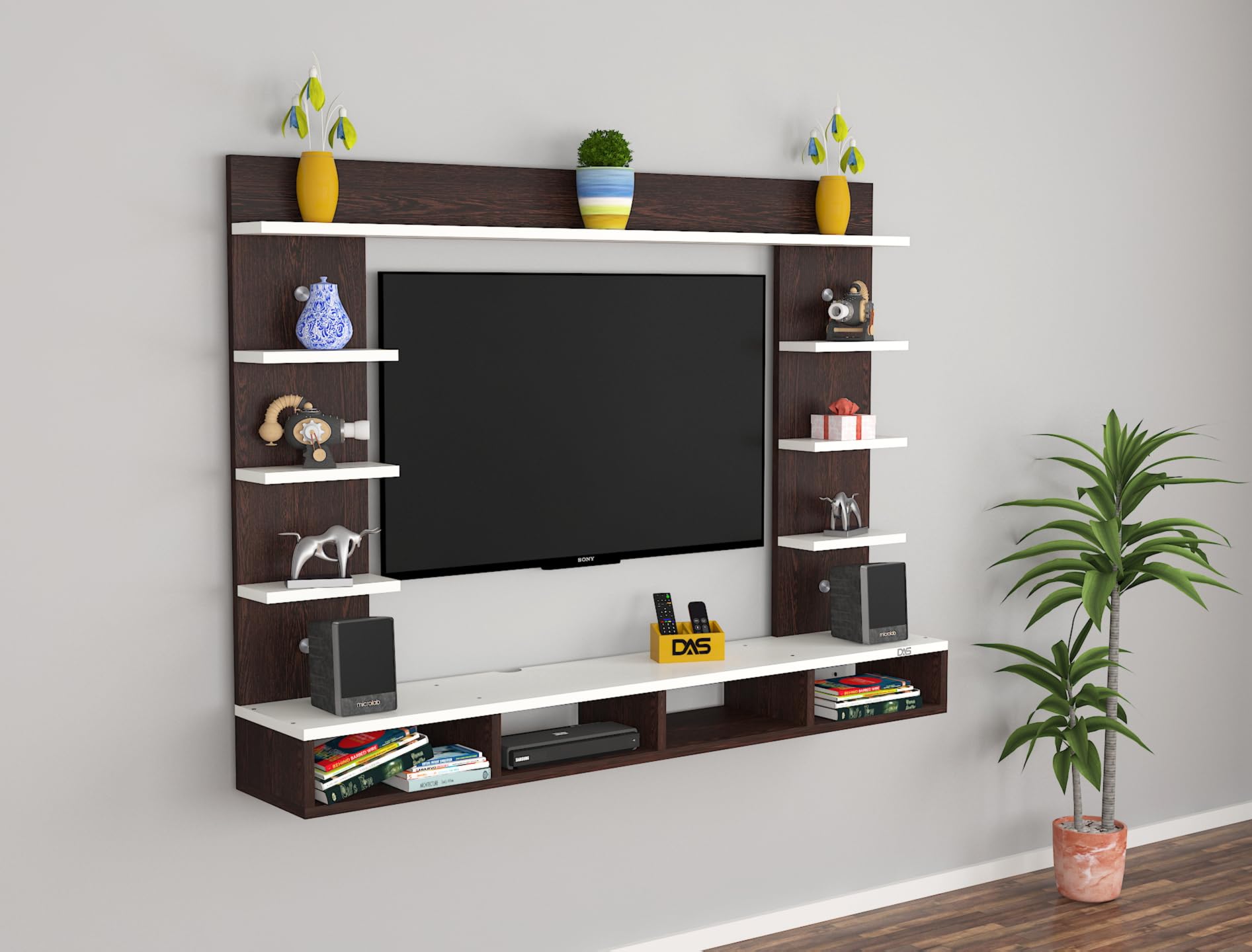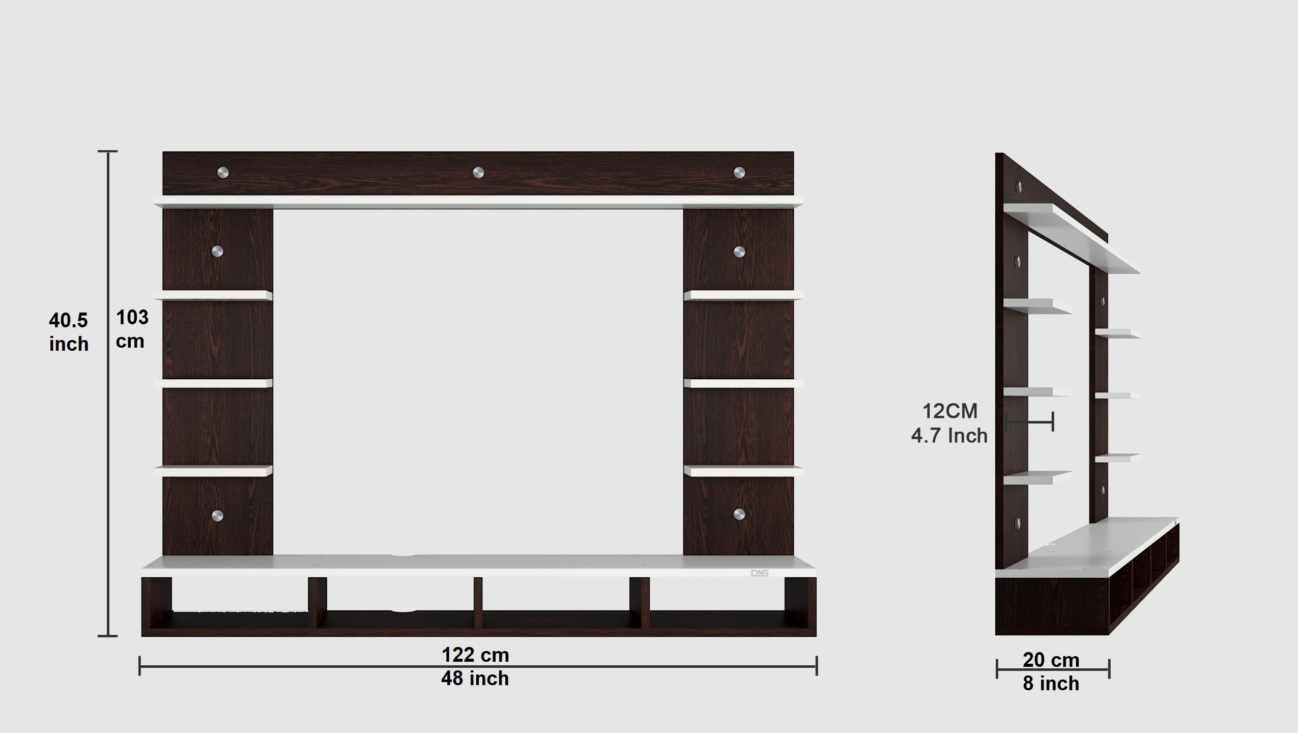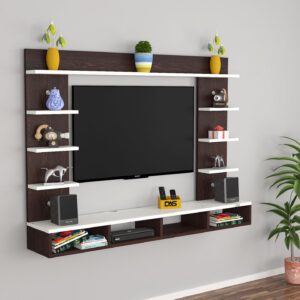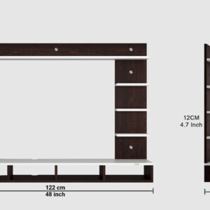 Material- Pre-laminated particle baord. Weight Capacity- 20 KG. Cable Management. Product Dimension- TV Cabinet- 122 x 20 x 15 CM, Wall Shelf- 20 x 12 CM, Shelf supporting Unit- 75 x 20 CM, Pop Out Shelf- 122 x 12 cm Weight- 12 KG
