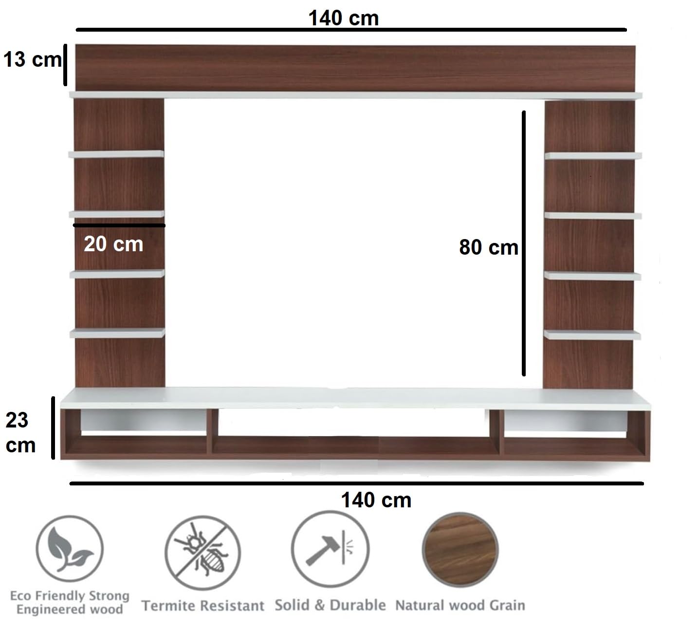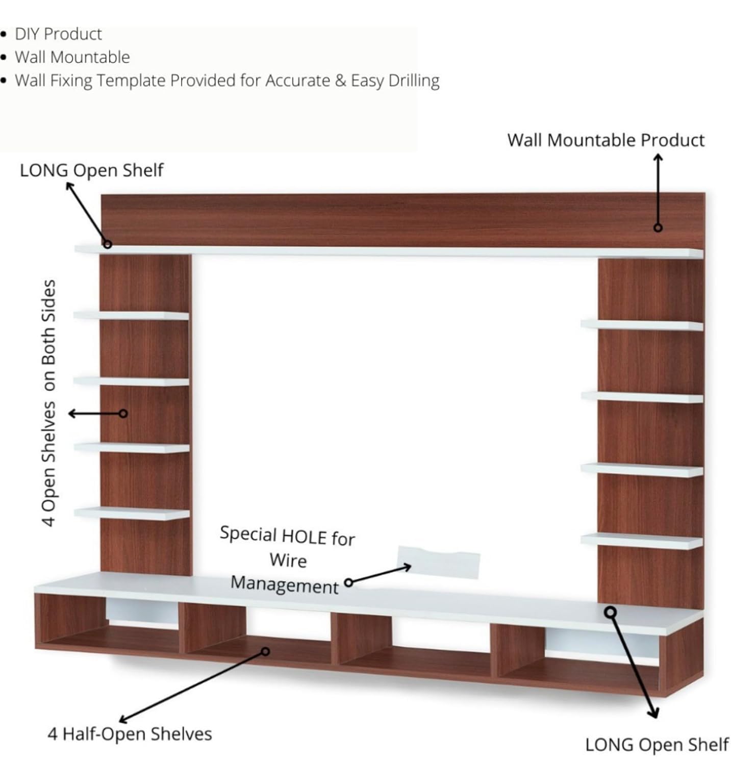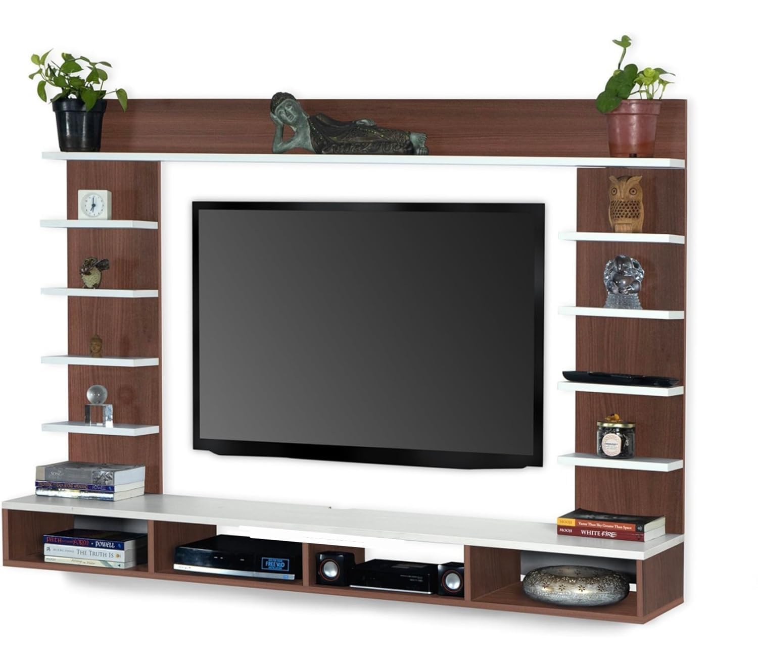 Wall Mount Engineered Wood TV Entertainment Unit is a sleek and modern solution for organizing your media space. Designed for contemporary living rooms, it includes a sturdy TV rack, set-top box stand, and complementary wall shelves that together create a clean and organized display. Crafted from high-quality engineered wood, this unit offers durability and long-lasting performance. The floating design not only saves space but also adds a touch of elegance to your wall. It is perfect for holding your television, remote controls, dΓ©cor items, and entertainment accessories, helping to keep your living area clutter-free and stylish. Ideal for modern homes, it blends functionality with visual appeal.