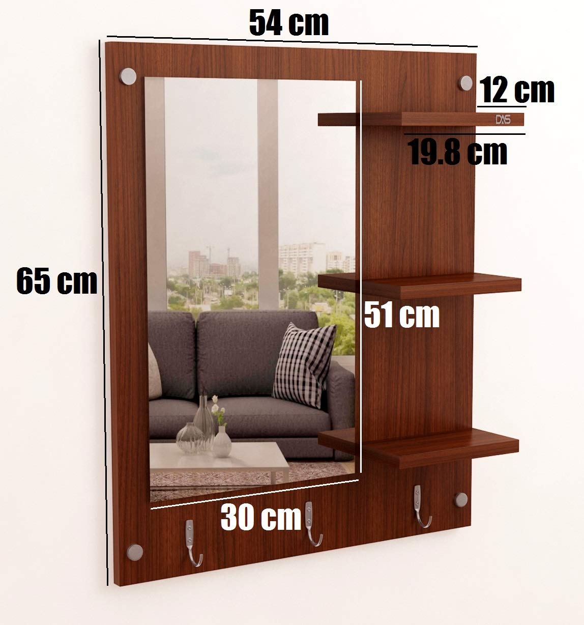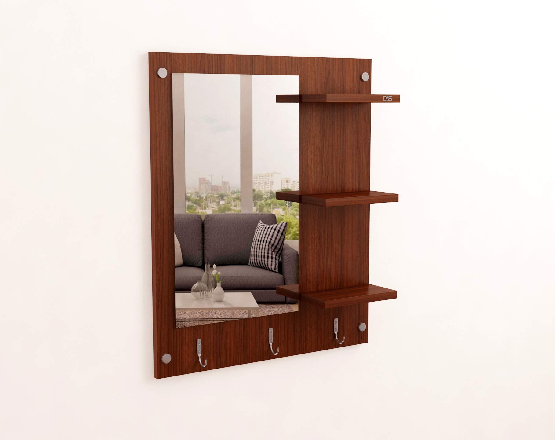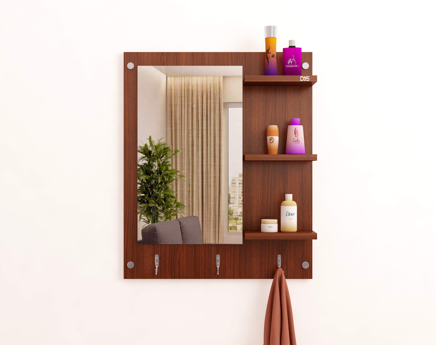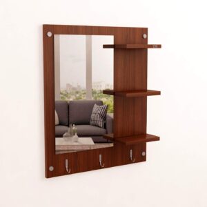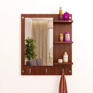 Wool & Wool Blend Wall Mount Makeup Vanity Dressing Mirror/Glass/Table and Multipurpose Rack Shelves with Elegant Double Stainless Steel Hooks (Classic Walnut)- Evelyn