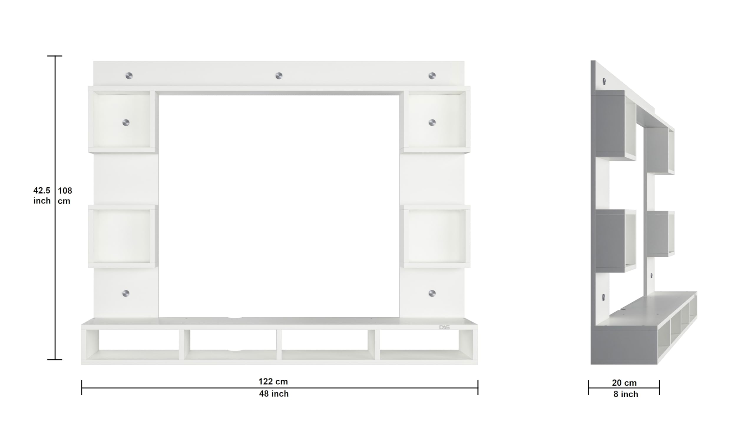 Material- Pre-laminated particle baord. Weight Capacity- 20 KG. Cable Management. Product Dimension- TV Cabinet- 122 x 20 x 15 CM, Wall Shelf- 20 x 12 CM, Shelf supporting Unit- 80 x 20 CM, Pop Out Shelf- 122 x 12 cm Weight- 12 KG